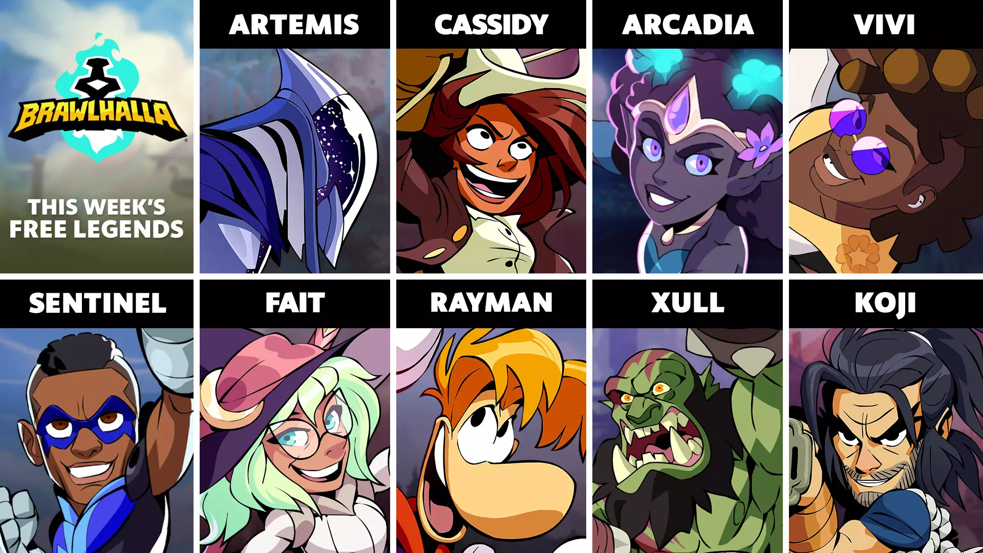 本周免费英雄轮换包括:阿耳忒弥斯、卡西迪、阿卡迪亚、薇薇、哨兵、费特、雷曼、沙鲁、小次郎。 阿耳忒弥斯——在宇宙中追寻宿敌俄里翁之后,阿耳忒弥斯撕裂了通往瓦尔哈拉的虫洞。她已准备好用火箭 lance 和镰刀战斗! 卡西迪——这位旧西部的执法官准备用锤子和 blasters 为瓦尔哈拉带来正义! 阿卡迪亚——从谦逊的甲虫农夫摇身一变成为仙灵族的荣耀女王。阿卡迪亚,这位芳野的伟大冠军,携着会唱歌的巨剑奥尔玛、她的邪术荆棘长矛以及忠实的甲虫伙伴多莫,在大锦标赛中参战。薇薇——她拥有幸运的爆破枪(配有猫咪挂饰)和无手侧空翻战斗靴,优雅的动作既危险又迷人。不参加大锦标赛时,她喜欢更新自己的猫咪博客《穿越统一皮毛》。 哨兵——美国首位也是最伟大的蒙面超级英雄来到了阿斯加德,他用短刀和战锤寻找需要保护的人,战胜不公。 菲特——她能与星辰对话,窥见未来,手持镰刀与宝珠为正义而战! 雷曼——梦之谷的冠军,挥舞着护手和战斧,为拯救家园而来到瓦尔哈拉。Xull——凭借传奇般的体魄,这位挥舞着巨斧与加农炮的兽人军阀已准备好挑战瓦尔哈拉中的一切! Koji——手持祖传武士刀,Koji用剑与弓在战场上开辟道路!