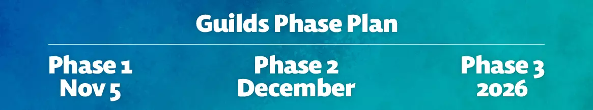 公会第三阶段(含公会对决)将于2026年推出。公会对决将每周自动匹配你的公会与敌对公会进行竞争。请在公会第二阶段上线后关注更多信息及具体日期。 公会系统包含多方面内容及众多功能,因此我们正与合作伙伴密切合作,确保每个公会阶段都能按预期运行。若任何平台在推出过程中出现问题,该平台的阶段更新可能会延迟。但请放心:我们将确保尽快添加相关内容。