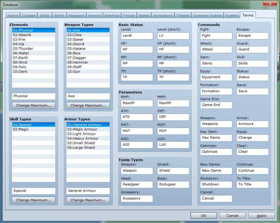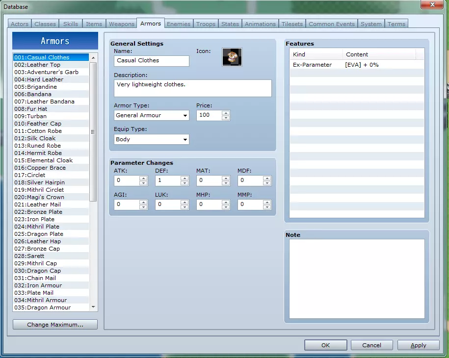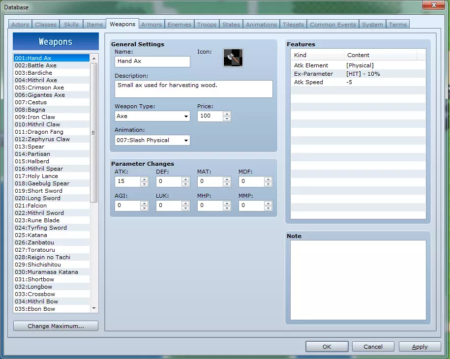 武器标签页包含游戏中所有武器的数据,也是添加更多武器的地方。 武器列表:选择此处列出的武器以修改其数据。 更改上限:此按钮可让你定义列表的长度。 常规设置: - **名称**:游戏中显示的武器名称文本。 - **图标**:菜单中用于表示武器的图像。 - **描述**:菜单中解释武器详细信息的文本。 - **武器类型**:决定谁可以装备该武器。 - **价格**:设为0将使武器无法在商店出售。否则,武器将以此处价格的一半出售。 - **动画**:选择使用该武器进行普通攻击时播放的动画。参数变更:此处为每项属性设置的值,代表角色装备该物品时属性的增减量。 特性:详见“特性窗口”部分。 备注:可在此处为自己(或团队成员,若为大型项目)留下备注信息,以便更好地理解内容。 标签6:防具