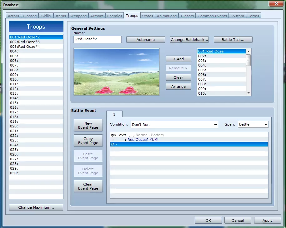 敌人标签页用于定义敌人的所有属性、奖励以及行动方式。 敌人列表:在此选择要修改数据的敌人。 更改上限:此按钮可用于定义列表的最大容量。 基本设置: - **名称**:游戏中显示的敌人名称。 - **MHP(最大生命值)**:敌人的最大生命值。 - **MMP(最大魔法值)**:敌人的最大魔法值。 - **ATK(攻击力)**:敌人的攻击属性,主要影响物理伤害。 - **DEF(防御力)**:防御属性,主要影响受到玩家物理伤害的量。 - **MAT(魔法攻击力)**:魔法攻击属性,影响所有魔法攻击的伤害。 - **MDF(魔法防御力)**:魔法防御属性,主要减少魔法攻击造成的伤害量。AGI:敏捷(AGI)主要影响行动顺序,敏捷值最高者(经技能修正等处理后)将率先行动。 LUK:运气(LUK)至少会影响抵抗异常状态的概率。 图像:双击图像将打开一个窗口,你可以在其中更改敌人的图片以及色调(色彩)。如示例图所示,我仅通过调整色调值,就将同一张蓝色史莱姆图片改为了红色。 奖励:此处输入的经验值(EXP)和金币数值决定了敌人在战斗中被击败时给予玩家队伍的数量。 掉落物品:在这里你可以选择最多3种怪物可能掉落的物品,以及它们的掉落概率。 行动模式:行动模式定义了敌人可以采取的不同行动及其发生概率。此外,还有一些可选条件可用于强制敌人在特定回合执行某些操作,例如当敌人的生命值或魔法值达到指定数值时、当敌人处于特定状态(异常状态)时、当队伍等级达到特定数值时,或者当特定开关开启时。另外,评分数字本身并不太重要,重要的是该数字与最高评分数字之间的差距,并且最高评分数字会被最频繁地使用。 功能:请参见“_窗口”部分。 注意:请为自己(如果是较大项目,也可以为团队成员)留下备注,以便于理解。 标签8:队伍