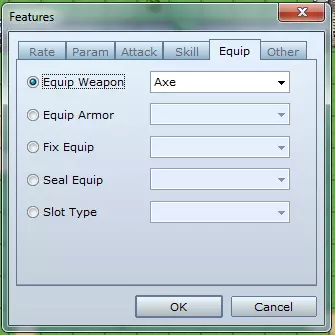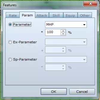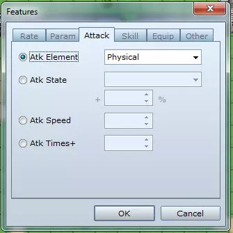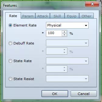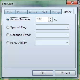 **倍率标签** - 伤害倍率:修改特定类型伤害的受击百分比。 - 弱化倍率:修改属性弱化效果的成功概率。 - 状态倍率:修改异常状态的生效概率。 - 状态抗性:定义对异常状态的免疫能力。对即死免疫的角色无法死亡。 **参数标签** - 基础参数:按百分比修改所选基础属性(如生命值、魔法值、攻击力等)。 - 额外参数:为隐藏属性添加所选百分比(如命中率、暴击率、生命回复、闪避率等)。 - 特殊参数:按百分比修改所选特殊参数(如魔法消耗、经验获取、防御率等)。 **攻击标签** - 攻击属性:定义普通攻击的元素属性。 - 攻击状态:定义普通攻击附加异常状态的概率。攻击速度:此数值将与敏捷相加,以决定战斗中的攻击顺序。 攻击次数加成:定义在普通攻击基础上额外增加的攻击次数。(+9 意味着总共 10 次攻击) 技能标签 - 添加技能类型:在战斗中添加“魔法”或“特殊”指令。 - 封印技能类型:从战斗中移除“魔法”或“特殊”指令。 - 添加技能:允许在战斗中使用选定的技能/法术。 - 封印技能:从战斗中移除选定的技能/法术。 装备标签 - 装备武器:指定要装备的武器。 - 装备 armor(护甲):指定要装备的护甲。 - 固定装备:锁定指定的装备栏位,防止其被卸下。 - 封印装备:禁止在某类栏位装备物品。 - 栏位类型:用于启用双武器的使用(双持)。其他标签行动次数加成:定义战斗中每回合可进行额外行动的概率。(例如,使用此功能5次可获得5次额外回合) 特殊标记: - **自动战斗**:角色无需指令输入即可自行战斗。 - **防御**:减少受到的伤害。 - **替罪羊**:当生命值较低的队友受到攻击时,该角色会代为承受伤害。 - **保留TP**:允许积累的TP保留到下一场战斗。 消失效果:定义敌人被击败时的消失方式。(仅敌人可用) 队伍能力:设置被动队伍能力(仅角色可用) - **遇敌减半**:在当前区域的遇敌频率降至通常的一半。 - **遇敌无效**:在当前区域不会遇到敌人。 - **取消突袭**:防止敌人在战斗中先行动。先发制人:提高我方队伍在战斗中优先行动的几率。 金币加倍:战斗中获得的金币数量翻倍。 物品掉落加倍:从敌人处获得的物品数量翻倍。 效果窗口