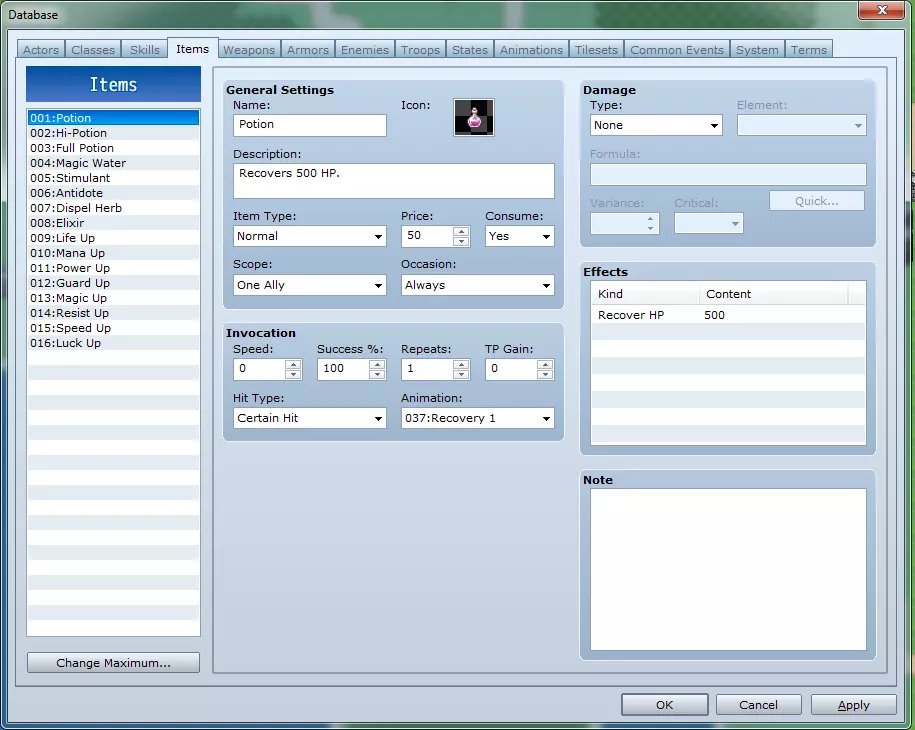 物品标签页包含决定使用物品时会发生什么的相关数据。 物品列表:在此选择一个物品以修改其数据。 更改最大值:此按钮允许你定义该列表的大小。 通用设置 - - **名称**:这是在战斗和菜单中显示的物品名称。 - **图标**:这是用于在菜单中代表物品的图像。 - **描述**:这是在菜单中选中物品时显示的文本。 - **物品类型**:在此选择“物品”或“关键物品”,以确定该物品在菜单中显示于哪个列表。 - **价格**:将价格设为0会使该物品无法在商店中出现,其他数值则定义该物品在商店中的售价。 - **消耗**:定义物品使用后是否会被消耗。作用范围:定义使用该物品时应瞄准的目标(或可供选择的目标)。 使用场合:定义该物品是否可在战斗中、菜单中、两者皆可使用,或均不可使用。 使用属性: - **速度**:此数值会应用于使用该物品的角色敏捷值,以决定战斗中的行动顺序。速度慢的角色可以快速使用高速度物品,反之亦然。 - **成功率**:物品的成功使用概率。若失败,则不会消耗该物品。 - **重复次数**:物品效果对目标的应用次数。 - **TP 获得**:定义在战斗中使用该物品后直接获得的 TP 值。**攻击类型**:在此选择伤害类型为物理、魔法或必中,以决定伤害/治疗量及命中率的计算方式。 **动画**:这是在战斗中对敌人使用该物品时播放的动画。 **伤害**:与“技能标签”中的伤害选项相同。 **效果**:参见“效果窗口”部分。 **备注**:为自己(或团队成员,如果是较大项目)留下说明,以便更好地理解内容。 **标签5:武器**