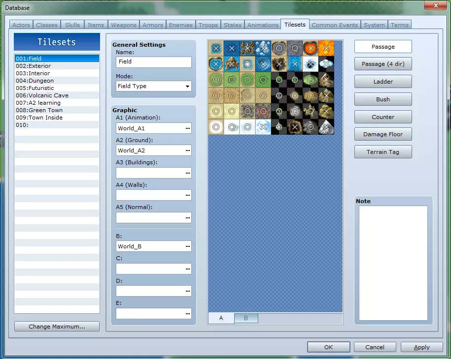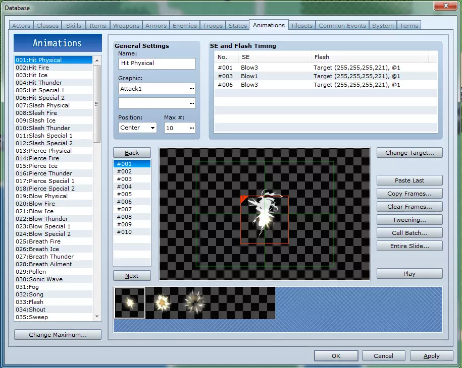 动画标签页用于为你的法术和技能创建自定义动画! 动画列表:在此选择一个动画以修改其数据。 更改最大值:此按钮可用于定义动画列表的大小。 通用设置 - 名称:这是你的动画名称,不会在游戏中显示。 图像:你可以在此选择最多两组图像集用于动画。 位置:动画播放时的锚定位置。若选择“屏幕”,动画将不会锚定到特定敌人,可能不会显示出击中敌人的效果。这主要适用于旨在攻击所有敌人的技能。 最大帧数:此动画使用的帧数。默认情况下,每秒显示15帧,因此150帧就是10秒的动画。 **音效与闪光时机**:在此处定义音效以及屏幕/角色闪光发生在哪一帧,持续多长时间。例如,如果你的技能向敌人降下10个火球,你可以为每个火球落地时的爆炸定义一个播放的音效,并让屏幕每次都闪烁。 **帧列表**:这是数字列表。点击其中一个数字,可以修改该帧显示的内容。 **更改目标**:此功能用于更改动画预览中显示的敌人。 **粘贴上一帧**:复制当前选中帧的前一帧,并粘贴到当前帧。例如,在制作新动画并完成第一帧后,开始制作第二帧时点击此按钮,将会得到第一帧的精确副本,以便在此基础上进行创作。 图像栏(底部):用于选择要放置在帧中的图像。 ------开发中------ 标签11:图块集