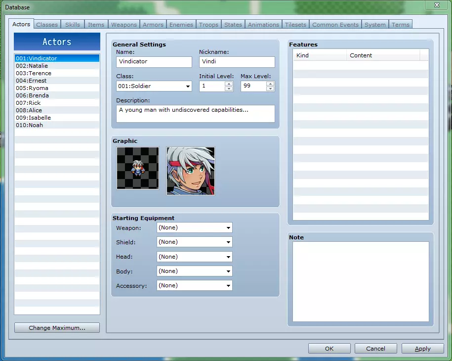 角色标签包含游戏中可成为队伍成员的角色数据。 角色列表:在此选择要修改数据的角色。 更改上限:此按钮可用于定义列表的大小。 通用设置 - 名称:这是角色在战斗和菜单中显示的名称。 昵称:角色的昵称会显示在角色的状态界面中。 职业:选择所选角色使用的职业数据。 初始等级:设置角色加入队伍时的默认初始等级。(可在事件中覆盖此设置。) 最大等级:角色可达到的最高等级。 描述:显示在状态界面底部的文本。图像:左侧图像是从选定图像组中提取的向下视角图像,用于角色在战斗外的世界地图行走。右侧图像是角色的面部图像,用于对话窗口和菜单中。 初始装备:在此处可以定义角色加入队伍时默认装备在各个槽位中的物品。 特性:参见“特性窗口”部分。 备注:可为自己(或团队项目中的队友)留下备注信息,以便更好地理解相关内容。 标签页2:职业