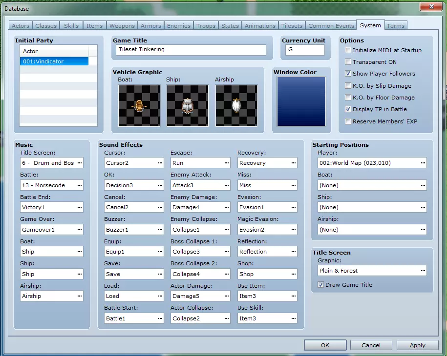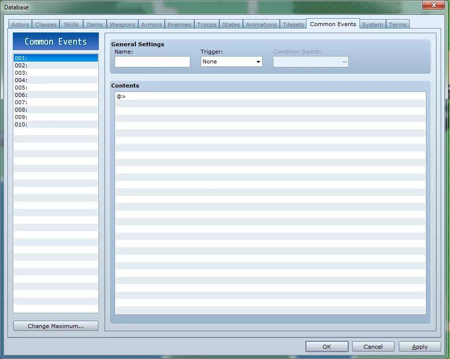 通用事件标签页包含各类事件(在Steam的新手指南中有介绍),这些事件为常用事件,集中存储于此以便快速访问,无需复制粘贴。 通用事件列表:在此选择事件以修改其数据。 更改最大值:此按钮可用于定义事件列表的规模。 通用设置 - 名称:用于指代此通用事件的名称。 触发条件:定义事件是否自动触发(自动执行)——需完成该事件后才能执行其他事件;或与其他事件并行自动运行(并行处理)。 注意:若选择并行处理,且未在事件结束时关闭条件开关,事件将持续重复运行,直至开关被关闭。条件开关:与上述“触发”选项中的自动执行或并行处理配合使用。当所选开关被设为“开启”状态时,事件将允许运行。 内容:此处用于放置事件本身。有关此处各选项的详细说明,请参阅Steam上的新手指南。 标签13:系统