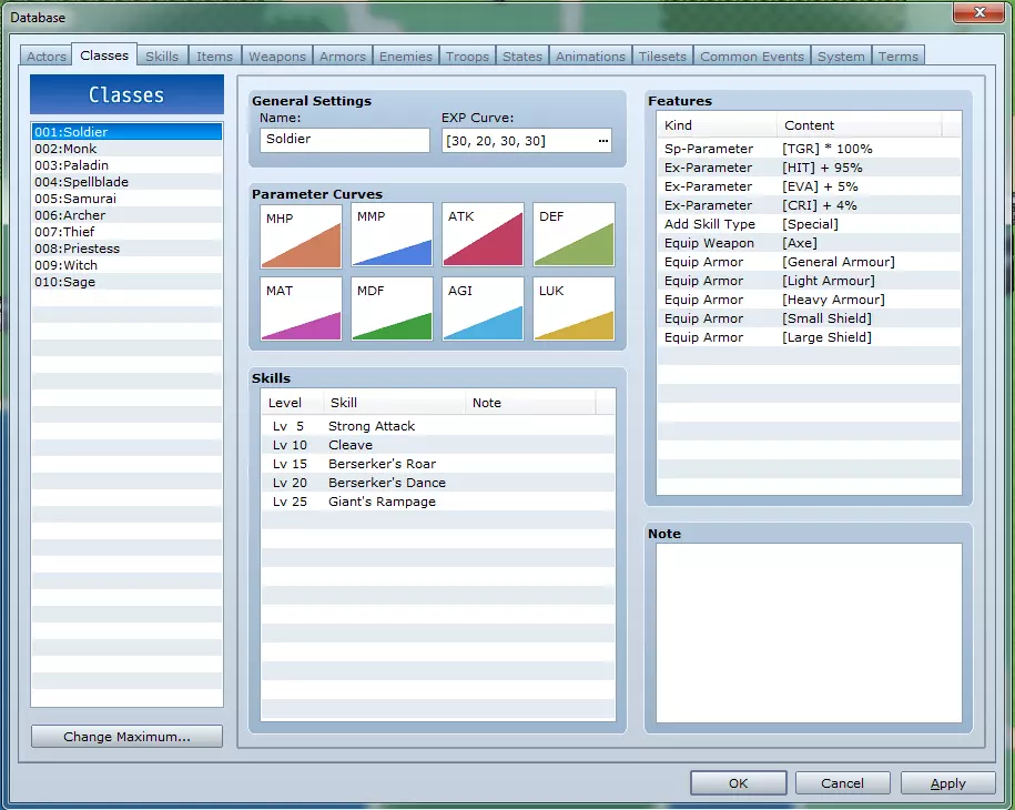 职业标签页允许你修改各个职业的差异化设定,包括升级速度、属性成长、特定等级习得的技能等! 职业列表:选择一个职业以修改其数据。 更改最大值:此按钮可用于设定职业列表的规模。 名称:这是职业在游戏中的显示名称。 经验值曲线:用于定义升级所需的经验值数量。 属性曲线:用于定义职业升级时属性的成长速率。默认情况下,属性值以固定速率增长,但你可以创建曲线,使早期或后期的成长速度变慢或加快,甚至可以为每个等级手动定义属性值。技能:在此处选择你的职业在达到特定等级时学习的法术和技能。 特性:参见“特性窗口”部分。 备注:为自己(或团队成员,如果是较大项目的话)留下信息,以便更好地理解内容。 标签3:技能
