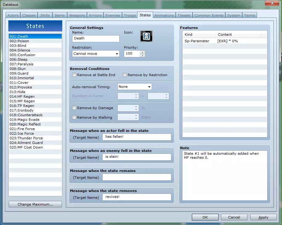 状态标签页包含所有状态异常、被动增益和死亡数据。 - **列表**:在此选择一个状态以修改其数据。 - **更改最大值**:此按钮允许你定义该列表的条目数量。 - **常规设置**: - **名称**:当前选中状态/状态异常的名称。 - **图标**:代表所选状态的游戏内图像。 - **限制**:此处选择的选项将使受此状态影响的角色在战斗中无法执行相应操作。 - **优先级**:此数字仅影响角色身上多种状态图标的显示顺序。若两个状态优先级相同,则在状态列表中出现较早的状态具有更高优先级。 - **移除条件**: - **战斗结束时移除**:定义该状态异常是否在其产生的战斗结束后仍然存在。按限制移除:若勾选,状态移除时限制也会一并移除。 自动移除时机:此处可设定状态自动移除的回合范围。 受伤害移除:定义受到任意伤害时移除该状态的概率。 行走移除:定义行走多少步后可移除该状态。 消息:这是战斗中角色/敌人获得状态、状态持续到下一回合以及状态被移除时显示的文本,均为可选内容。 特性:参见“特性窗口”部分。 备注:可在此处为自己(或团队项目中的队友)留下备注,以便更好地理解相关内容。 标签10:动画
