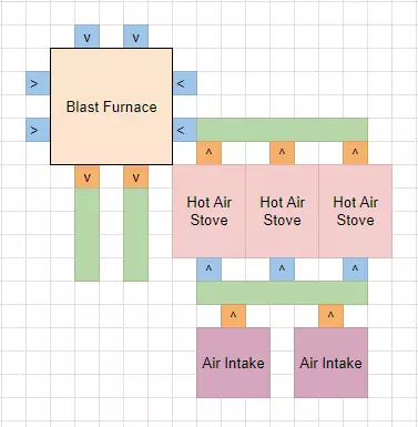 如图所示,这座高炉每分钟消耗324,000升热风,而一座热风炉每分钟仅能供应108,000升热风。要为一座满配高炉提供充足热风以维持其温度,需要3座热风炉。 这3座热风炉还需要每分钟324,000升的普通空气,由进气口提供。每个进气口每分钟可提供162,000升空气,因此只需2个进气口即可满足上述3座热风炉的需求。 综上所述,对于1座高炉(已选择所有模块),你需要: 3座热风炉 2个进气口