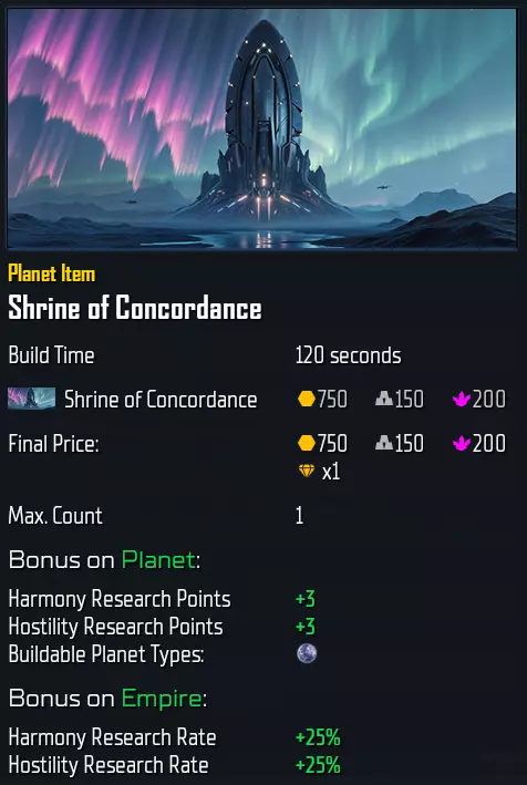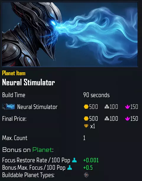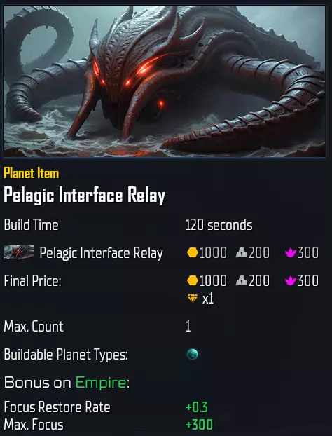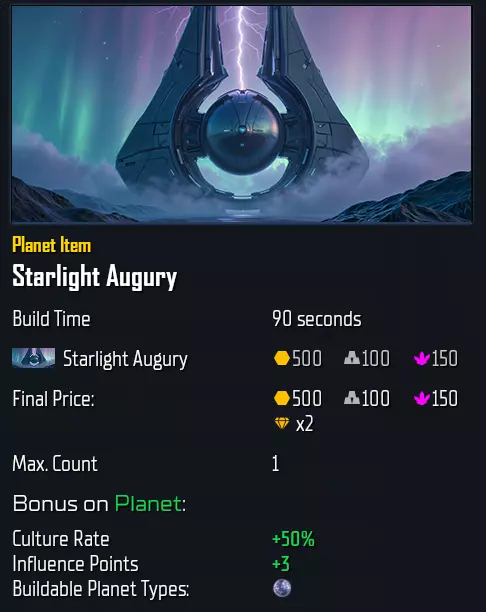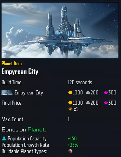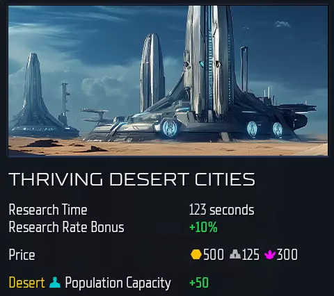 专精: 专精将增加2个民用槽位(即1个重型工厂位置)和1个星球物品槽位。 对于“ Advent Wrath”,以下星球类型可按如下成本研究专精: barren星球:T2.1,500/125/300/Indurium 沙漠星球:T2.2,550/150/350/Andvar 辐射星球:T3.2,850/275/650/Tauranite 地磁星球:T3.1,800/250/600/Kalanide 原始星球:T2.2,550/150/350/Andvar 人口增长 bonus technologies(加成科技) 繁荣沙漠城市:+50,无槽位(非物品) 沙漠