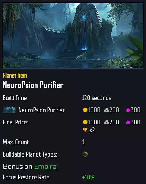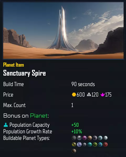 圣所尖塔 +50 贫瘠*、贫瘠卫星、水晶、沙漠、铁质、冰原*、冰卫星*、辐射、地磁、卫星、海洋*、原始、地球、火山*、火山卫星* *存在更优升级,但可与这些护盾叠加(需占用2个槽位)