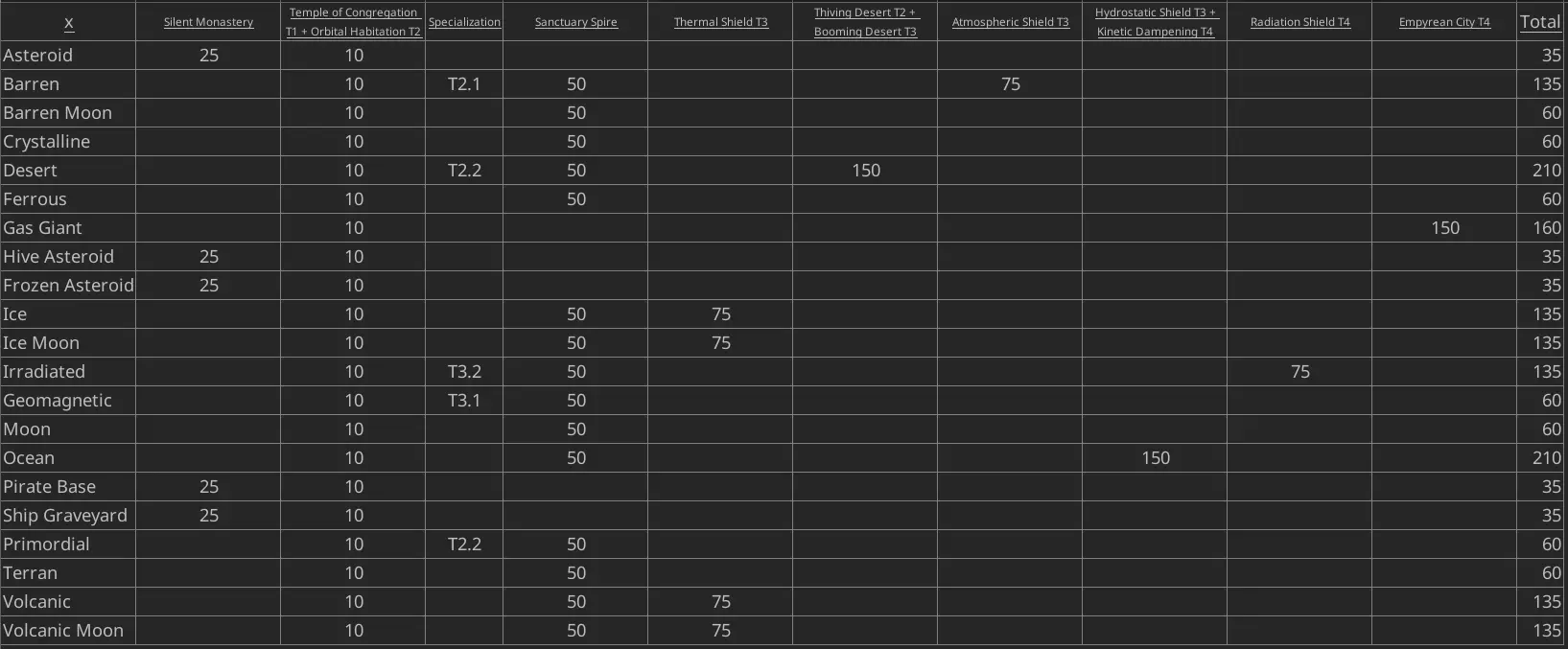 寂静修道院 集会圣殿 T1 + 轨道栖息地 T2 专精 圣所尖塔 热能护盾 T3 繁荣沙漠 T2 + 蓬勃沙漠 T3 大气护盾 T3 流体静力护盾 T3 + 动能阻尼 T4 辐射护盾 T4 九天之城 T4 总计 小行星 25 10 35 荒芜星球 10 T2.1 50 75 135 荒芜卫星 10 50 60 水晶星球 10 50 60 沙漠星球 10 T2.2 50 150 210 铁质(Ferrous) 10 50 60 气态巨行星(Gas Giant) 10 150 160 蜂巢小行星(Hive Asteroid) 25 10 35 冰冻小行星(Frozen Asteroid) 25 10 35 冰(Ice) 10 50 75 135 冰卫星(Ice Moon) 10 50 75 135 辐射区(Irradiated) 10 T3.2 50 75 135 地磁区(Geomagnetic) 10 T3.1 50 60 月球 10 50 60 海洋 10 50 150 210 海盗基地 25 10 35 船只墓地 25 10 35 原始 10 T2.2 50 60 人族 10 50 60 火山 10 50 75 135 火山月球 10 50 75 135