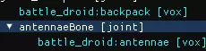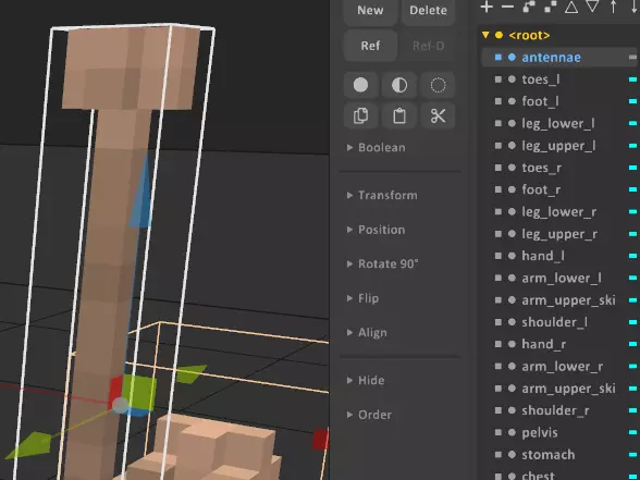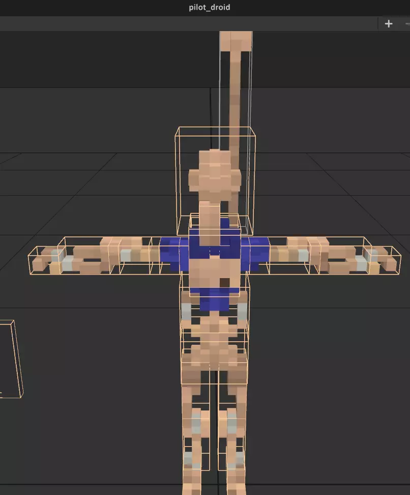 基础操作如下: - **左键点击**:选择模型上的体素(模型部件)或关节。 - **右键点击+拖动**:围绕固定点旋转镜头。 - **中键点击+拖动**:移动镜头位置。 - **滚轮**:放大或缩小视角。 - **Shift键**:将移动 gizmo(用于移动物体的小箭头)切换为旋转 gizmo,可对物体进行旋转操作。此时箭头会变为曲线,点击并拖动曲线即可根据设置的吸附量旋转物体。 创建关节与配饰 有两种制作配饰的方法:方法A(如下所示)是生成一个关节,然后将配饰连接到该关节上。这最适用于动态配饰,例如枪套、披风、尾巴、宽松的帽子或天线;我将为我的玩家模型添加的就是后者。 方法 B(下一节)稍微简单一些,不涉及关节,但仅适用于静态配饰。像标签、贴纸、小细节或任何缩小的物品都最适合使用此方法。对于战斗机器人玩家模型,我会在胸部添加一个写着“B-01”的小标签,这是我之前在 Magicavoxel 中建模的。 添加配饰:方法 1(动态) 1. 创建关节