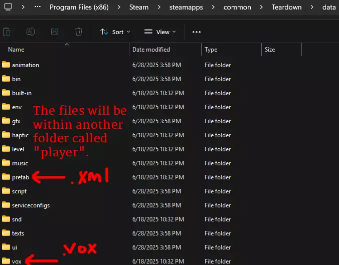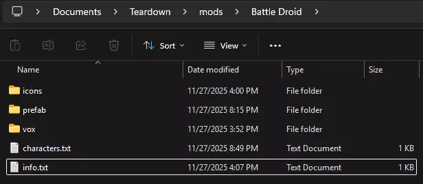 方法二:使用内部角色 此方法较为复杂,但我会全程指导你,请耐心跟随。若你希望使用特定角色的待机动画,可直接提取内部角色文件。首先进入“文档 / Teardown / mods”目录,创建一个任意名称的文件夹作为你的模组根目录。在根目录内,创建info.txt、characters.txt文件,以及另一个名为“characters”(确保为复数形式)的文件夹,在该文件夹中再创建vox和prefab文件夹。