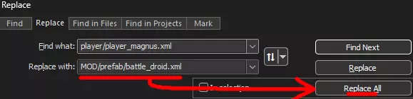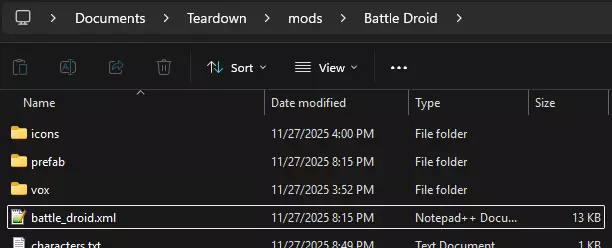 访问《拆迁》目录后,找到data/vox/player路径下的.vox文件和.xml文件。从你想要使用其动画的角色中复制相应的.vox和.xml文件。在本指南中,我将使用马格纳斯,因此我会复制player_magnus.vox和player_magnus.xml,并将player_magnus.vox粘贴到我的vox文件夹中,将player_magnus.xml粘贴到我的prefab文件夹中。现在你可以重命名你的.xml和/vox文件,但要记住新名称,因为它们在接下来的步骤中很重要。我将它们重命名为battle_droid.vox和battle_droid.xml,你也可以根据你的角色进行重命名。 如果你在重命名时没有看到“.xml”或“.”末尾的“vox”没有问题;如果你想查看它,在Windows系统中,你可以点击“查看”>“显示”>“文件扩展名”,并确保该选项已勾选。 接下来,你需要用记事本或Notepad++打开你的.xml文件。再次说明,我推荐使用Notepad++,但普通记事本也可以。在第一行,你应该会看到“name="instance=player/player_[你选择的角色].xml”这样的内容。以我为例,这一行显示的是“name="instance=player/player_magnus.xml"”。这是直接来自目录内的原始.xml文件路径,但这不是我们需要的路径,所以必须进行修改。首先,在开头添加“MOD”;“MOD”这个关键词指的是你的模组目录。然后,添加你的模组的新.xml文件路径。以我为例,我将player_magnus.xml复制粘贴到了我的Prefab文件夹中,所以我的路径是“MOD/Prefab/battle_droid.xml”。.