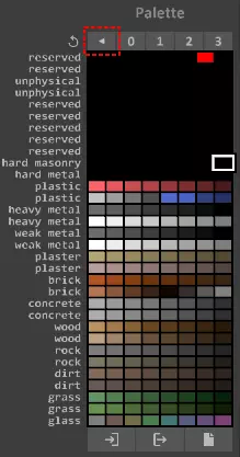 左键(LMB)用于选择物体(模型周围的那些浮动立方体),双击可将物体进入编辑模式。编辑控件位于左上角,调色板的右侧。 物体在右侧的物体树中命名,可通过右键点击物体树中的物体进行重命名。请注意,在MagicaVoxel或Teardown编辑器中,多个物体不能重名。 右键(RMB)用于移动视角,中键(MMB)拖动可将视角移至不同的焦点位置。 默认情况下,编辑模式下的体素画笔为立方体,但建议将其更改为右侧所示的单个体素。 通过选择左侧调色板中的颜色来更改画笔颜色。更改调色板中的颜色将改变应用于模型的颜色。 调色板和材质