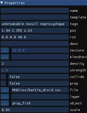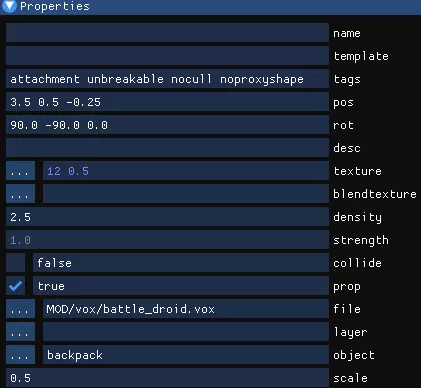 右键点击关节,再次选择“新建 > Vox”。在属性中,将其重命名为配件的名称,然后在标签栏输入“attachment unbreakable nocull noproxyshape”。这些标签是必要的,能让游戏识别出这是一个配件,使其无法被破坏、不会被剔除(隐藏),至于“noproxyshape”,我其实不太确定其作用,抱歉啦。 接着在文件中,选择你的模型的.vox文件。你可能会被一个巨大的玩家模型吓到,这是正常现象。在属性中,将对象设置为你想要添加的配件;这就是名称很重要的原因,因为你需要通过名称来找到它。最后,将缩放比例设置为0.5。