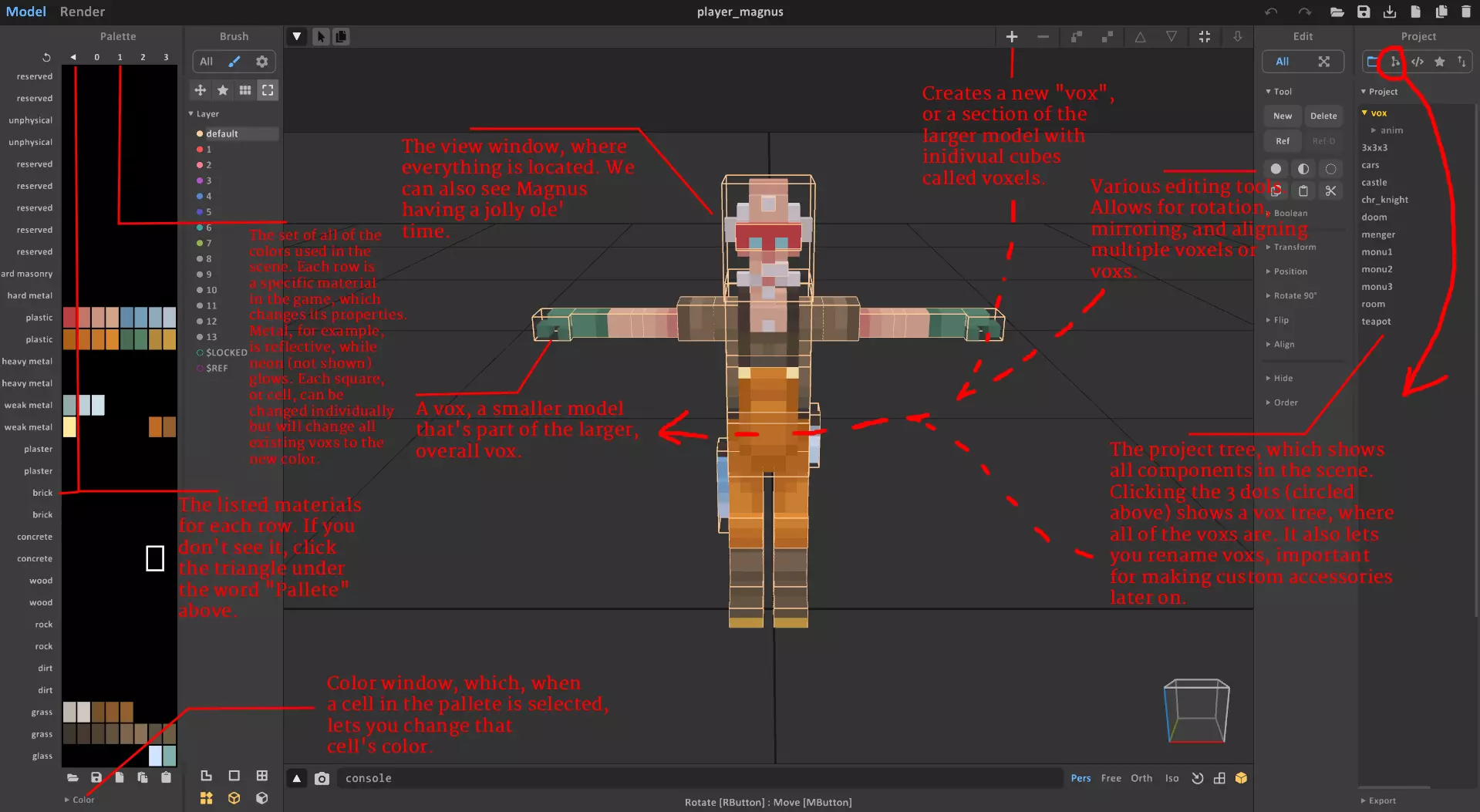 《拆迁》拥有独特的MagicaVoxel调色板。每一行(不包括保留行)都对应游戏中的一种特定材质,这意味着材质已内置,可供模组制作使用。这意味着,如果你为衬衫使用金属材质,那么这件衬衫在游戏中会呈现出反光效果;相比之下,若使用草地纹理,则会应用一种细微的随机纹理。你可以在MagicaVoxel的“渲染”页面中预览材质,具体位置在模型旁边的左上角。 你可以通过点击调色板上的任意方块或单元格来更改颜色,然后点击调色板底部的“颜色”按钮,这会弹出一个小窗口,允许你手动更改颜色或使用RGB(红绿蓝)颜色代码。