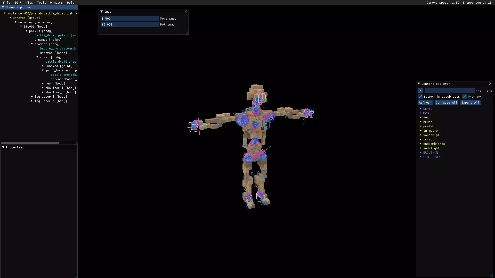 以下是我打开战斗机器人玩家模型后编辑器的界面图像。如果左侧没有显示场景树,只需点击玩家模型的某个部分,相关内容就会出现。你可以点击右侧图像查看完整尺寸。 四个主要窗口分别是: 1. **场景浏览器(左上角)**:包含所有骨骼、关节和体素模型的场景树。 2. **属性窗口(左下角)**:点击某个部件后,会显示可调整的属性,如关节限制、位置、旋转、体素缩放等。 3. **内容浏览器(右下角)**:包含画笔、脚本等内容;该窗口多用于地图制作,因此我们暂时忽略它。 4. **吸附(顶部,场景浏览器旁边)**:可用于调整吸附功能,数值为0。5键将吸附功能设置为一个体素立方体,你可以根据大多数关节、体素模型或其他物体的需求来缩小这个吸附范围。