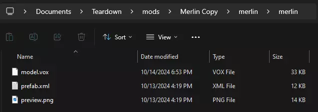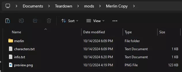 你的模组根文件夹目录现在应包含characters.txt、info.txt、preview.png(这将作为你在Steam创意工坊中的模组图标),以及merlin文件夹。在merlin文件夹内,还需有一个次级merlin文件夹,其中存放着model.vox、prefab.xml和preview.png;这个次级preview.png是模型在游戏内的图标。