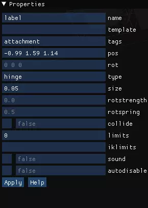 还记得你在MagicaVoxel中为对象命名的场景吗?这就是原因所在。若要添加配件,请右键点击你要附加配件的体素,然后依次选择“新建”>“关节”。在属性窗口中,选中关节后: - 为关节命名 - 将关节缩放调整为0.05(你也可以设置更大的值,但通常0.05就足够了) - 在“标签”处粘贴附件 - 在“类型”部分,将关节设置为以下类型之一: - **球型关节**(可在所有方向自由移动) - **铰链关节**(像门一样沿轴移动;可在“限制”中设置限制) - **锥形关节**(类似球型关节,但只能在部分圆周范围内活动;“限制”可调整锥形的半径和旋转范围) - **棱柱关节**(我不清楚这玩意儿有什么用)。 2.设置关节限制 rotstrength(旋转强度)和rotlimits(旋转限制)决定了将配件拉回初始位置的“弹簧”强度,简单来说就是重置速度。0.9的值会让配件几乎立即弹回,而0.1的值即使轻微移动也会导致配件四处晃动。 3. 添加配件模型