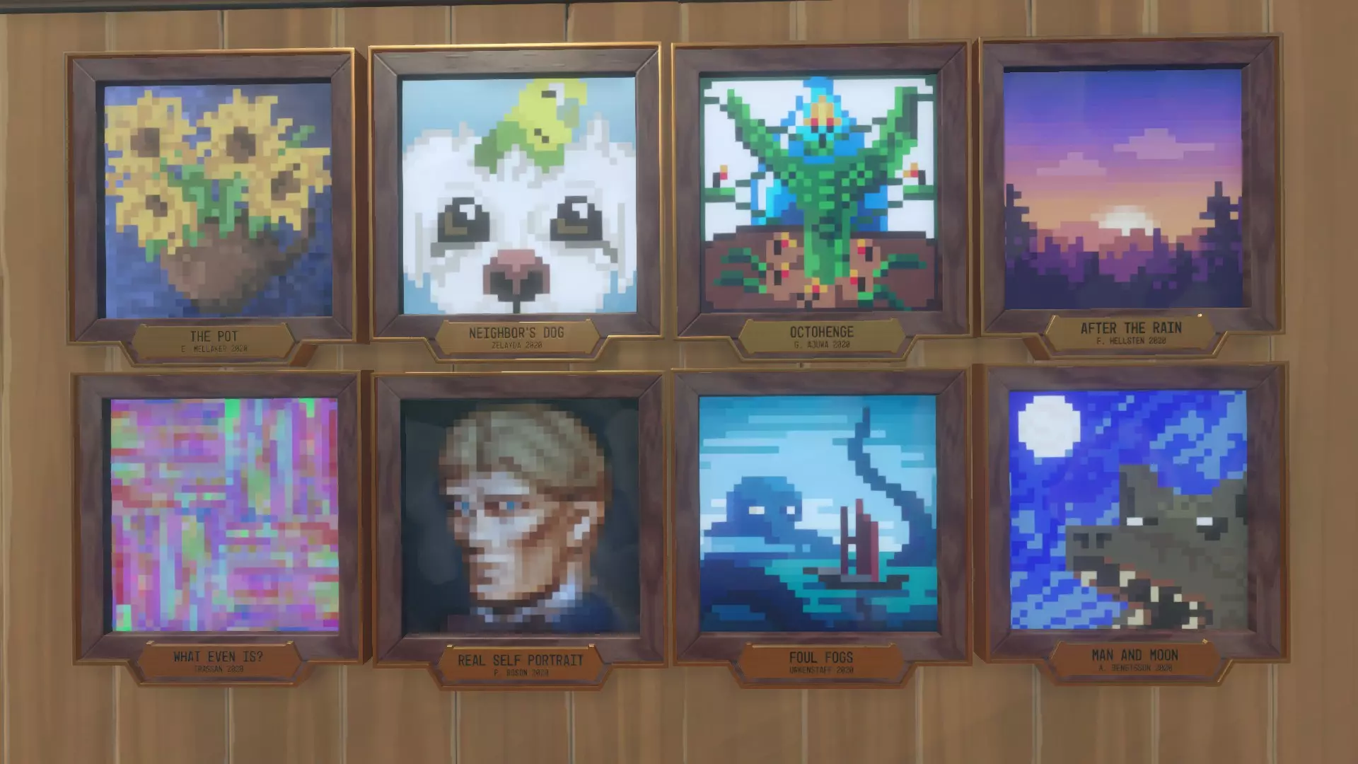 艺术收藏! 寻找并放置所有开发者画作。 ● 你需要找到全部八幅开发者画作并将它们挂在墙上。 ● 画作可以通过金属探测器在寻宝活动中找到,且找到的几率较低。只需在寻找提基碎片的同时搜寻它们即可。 ● 下方是一张包含你需要寻找的全部8幅画作的图片!