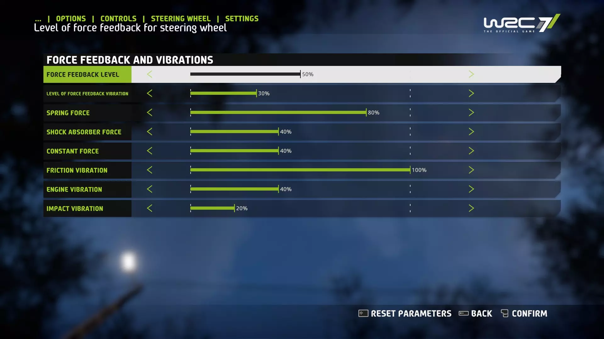 最后,进入力反馈设置进行调整。这是一个不错的起点。你可以根据需要提高或降低力反馈(Force Feedback)等级(设为50%),以获得更强或更弱的强度。