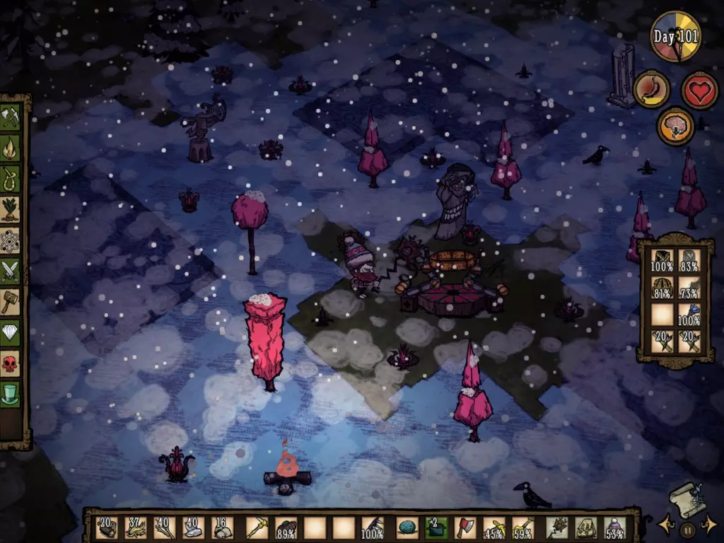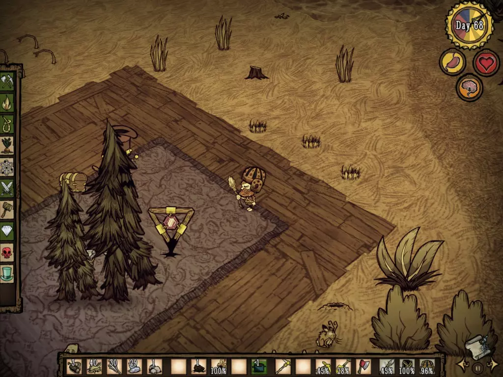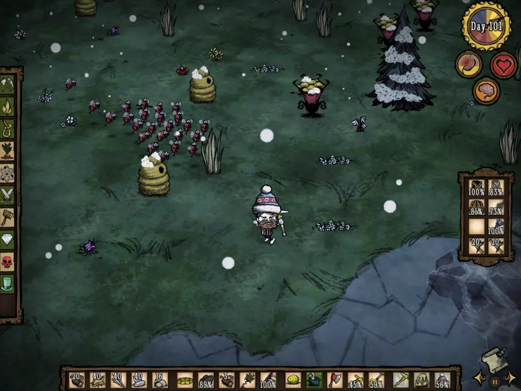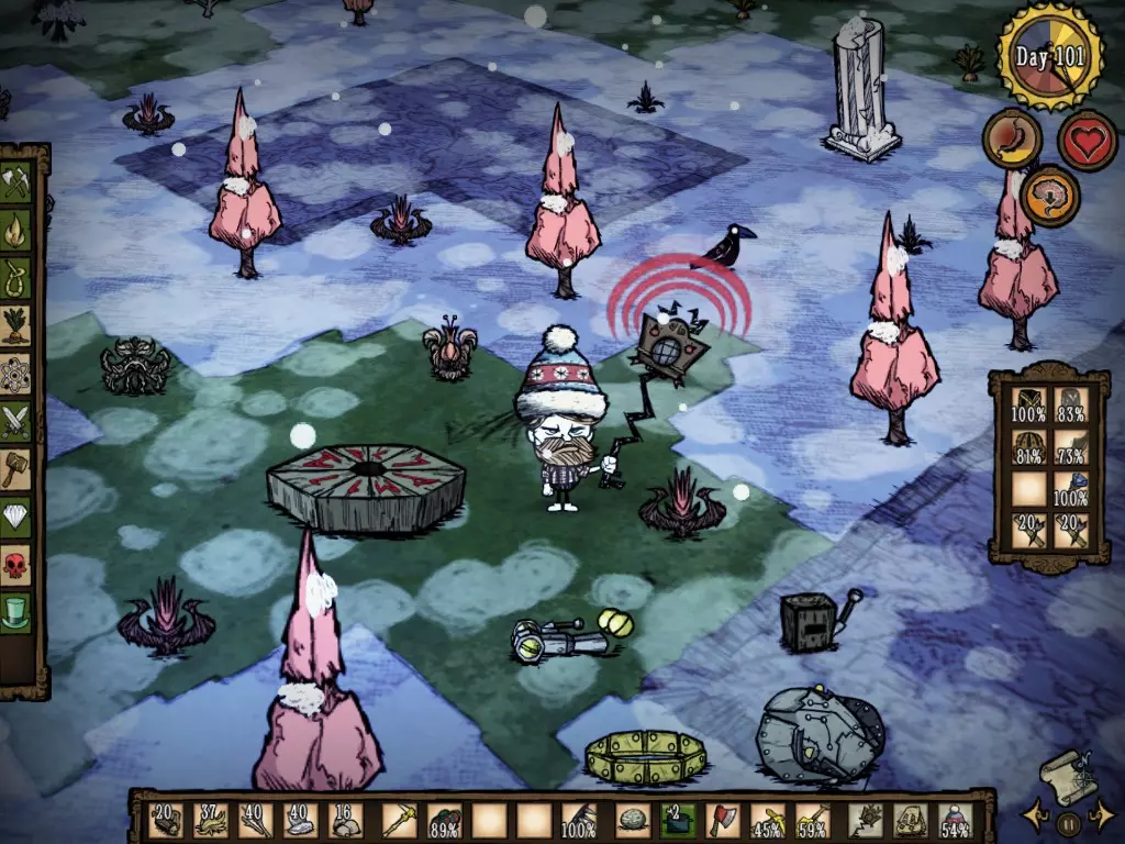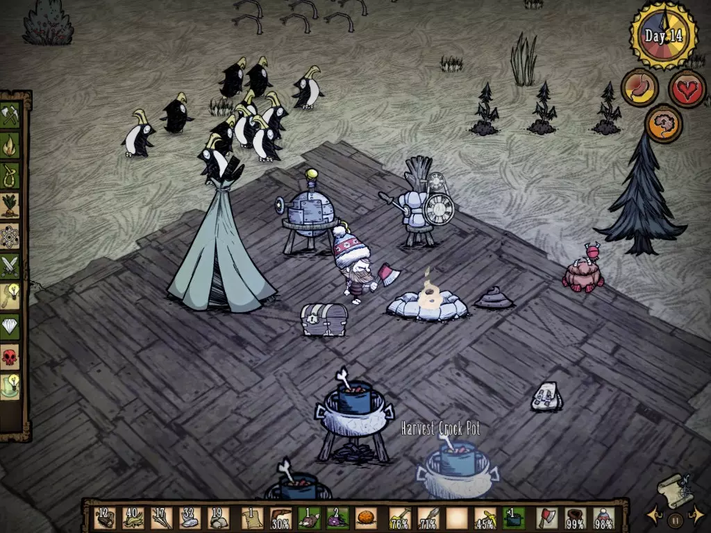 Para "Invocá-lo", tenho algumas teorias: 1) Achar um Aglomerado de várias árvores e começar a derrubá-las. 2) Derrubar diversas árvores grandes, e estar perto de outras iguais. 3) Ter uma Sanidade ruim. 4) Derrubar alguma árvore menor perto de uma árvore grande. 5) Árvores que passam por diversos ciclos (semente, pequena, média, grande, seca, pequena, média, grande, seca, ... repetidamente) se tornam a Tree Guardian. 6) Ter inúmeras madeiras e Sementes de árvore no inventário. 7) Queimar as sementes no fogo. 8) Derrubar diversas árvores, em série, no mesmo dia. 9) Atingir uma determinada quantidade de árvores a serem derrubadas. e, a que eu mais acredito, depois de diversas vezes frustrado tentando invocar a Tree: 10) Porcentagem. Essa porcentagem pode aumentar variando com base em alguns aspectos, dos quais eu não sei, mas desconfio, que podem ser: período do dia, quantidade de árvores derrubadas, quantidade de árvores em volta e sanidade Sobrevivendo ao inverno Após adquirir certa experiência no jogo, é hora de enfrentar o Inverno. Algumas considerações do inverno, que você precisa saber: - Seu calor corporal é muito importante. - Colmeias não geram mel (As abelhas não saem da colmeia). - O temido DeerClops aparece e destrói inumeras coisas. - O Dia fica mais curto, o entardecer e a noite ficam mais longos. - Os pássaros vermelhos são trocados pelos azuis. - Os Fire Hounds são substituídos pelos Ice Hounds. - As lagoas congelam. - O mapa fica em cores frias - Pela alta taxa de "Tarde e noite", a sanidade tende a cair mais. - Iglus aparecem, junto com os MacTusks Primeiramente, você precisa A TODO CUSTO de uma Thermal Stone, dependendo de uma Alchemy Engine. Uma vez equipado e pronto para o Inverno, tenha algo em mente: Sempre Coletar alimentos. Tente sempre coletar árvores também, pois sempre deverá ter uma fonte de calor. Tente se movimentar pelo mapa, especialmente se não quiser enfrentar o Deerclops quando ouvir os barulhos estranhos e fortes, mas não fique se deslocando demais da base. Quando ficar mais experiente se movimentando pelo mapa no Inverno, tente procurar pelas pegadas do elefante mais uma vez. O Koalefant gélido não é mais difícil que o elefante do Outono, mas digamos que é mais dificil se movimentar no frio. Quando achá-lo, pegue sua tromba azul, e vá atrás de mais teias. Se você achar interessante, construa um casaco com essa tromba azul. A tromba azul permite criar uma vestimenta de maior eficiência do que a vermelha. No inverno, você deve procurar por certos itens, e preservar sua sanidade e não padecer de fome. Os itens mais procurados no inverno devem ser A Boina, o Blow Dart, o dente do MacTusk para fabricar o Walking Cane e a gema Azul dos Ice Hounds. Vale ressaltar que os Ice Hounds dropam muito mais dentes, portanto, pegue diversos para criar Tooth Traps e Linhas de Costura. Com a Linha de costura você manterá uma vestimenta no seu inventário sem precisar ficar criando outras iguais. Cuidado com a Morsa (MacTusk)!!! Na sua primeira aparição, eu fiquei extremamente espantado. Eu pensei: "Nossa, o que eu faço? Vou pra cima, não vou... espera, ele está vindo pra cima de mim!!!" E eu sai correndo. Neste mesmo mapa, eu acabei morrendo para um Tall Bird, e resolvi que na próxima eu iria testar o que acontecia se eu fosse pra cima. Dito e feito: Em outro Mundo, resolvi explorar o mapa, até que achei um Iglu, e este Mob veio pra cima. Ele acertou um dardo que tirou 40 de Saúde, eu tinha apenas 160. Eu corri, mas ele me acertou outra vez. Entrei em desespero, e então ele me acertou uma terceira. E ainda sim, ele continuou correndo, mas não atirou mais nenhum dardo, e eu sai com 40 de HP (saúde). Vale ressaltar que estava sem Armadura. Ou seja, a morsa pode dropar Itens muito bons, A Boina, o Dente, o Blowing Dart, porém seja forte para matá-lo. O Perigoso Monstro das Neves: DeerClops. Acredite, é assustador enfrentar este Mob. Ele aparecerá primeiramente fazendo um barulho diferente no mapa, muito alto, e seu personagem irá dizer algo do tipo "That Sounded Big". Como sabemos, após atualizações foi implementado um sistema onde monstros proximos deixam o nível de sanidade cair. Agora Imagine: Você está lá, na sua base super construída, e de repente aparece um gigante, destruindo muros, plantações, máquina de ciencia e etc, seu nível de sanidade cai drasticamente, mas voce não sabe nem mesmo como enfrentar aquilo! Passam alguns dias, e ele vai embora, e sua base esta destruida, porém, perto do Inverno acabar, lá vem ele de novo, e sua sanidade cai mais ainda. Você então decide enfrentá-lo, leva muito hit, mas consegue matá-lo... quando percebe, sua sanidade está em 20. Pronto, prepare-se para enfrentar Monstros das Trevas, mas em um pequeno deslize, ca bum, morre. Uma forma muito drástica de se descobrir este mob na atualização, não é mesmo? Triste ...