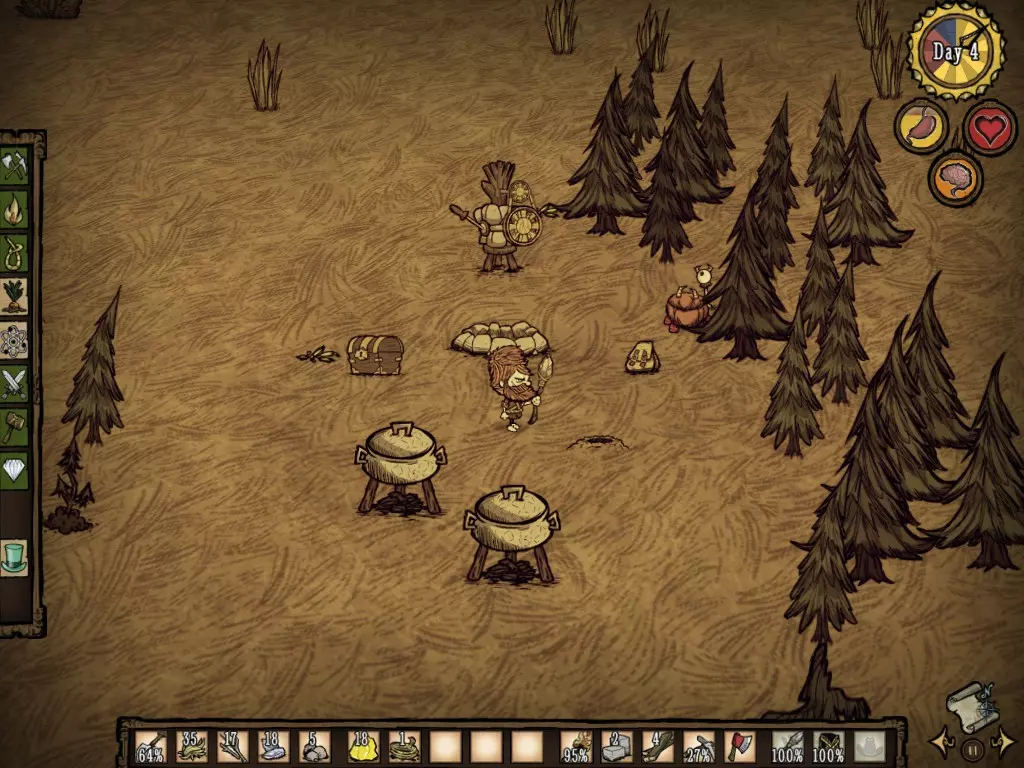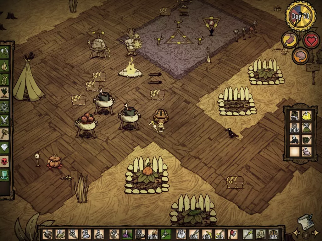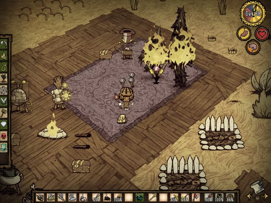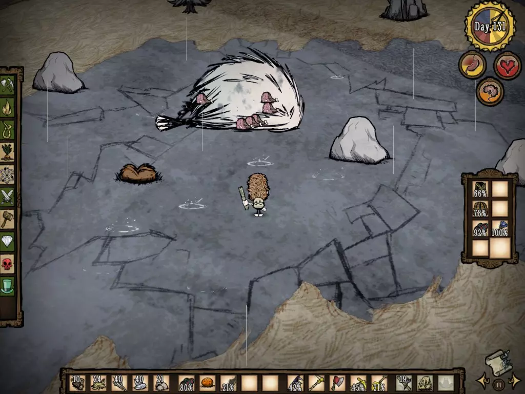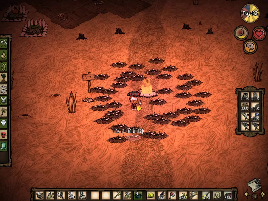 活下去至关重要,但经验丰富的玩家都知道,有时候情况会失控,你就是会死亡。那么,为什么不制作肉像呢? 随着时间推移,掌握周围资源的运用能力和烹饪食物的技巧,将是你生存的关键。 此外,学会切换物品也非常必要,尤其是盔甲的切换。 久而久之,你需要掌握每种生物的攻击方式,以及何时该躲避它们。学会闪避和攻击,能降低你的生命值消耗。 时刻问问自己:“这么做值得吗?”尤其是在攻击处于交配期的野牛时。归根结底,在游戏中度过100天后,你会发现自己拥有了多个农场、多个烹饪锅、收集了大量木材,基地周围种满了树木,还布置了许多牙齿陷阱。 但如果即便如此,你仍然不清楚如何安全地继续游戏,我会提供一个简短的生存指南: 生存模式生存指南 好吧,你已经撑过了最初的10天,却不知道如何活到100天,甚至1000天!