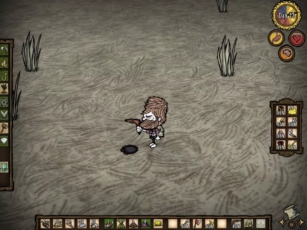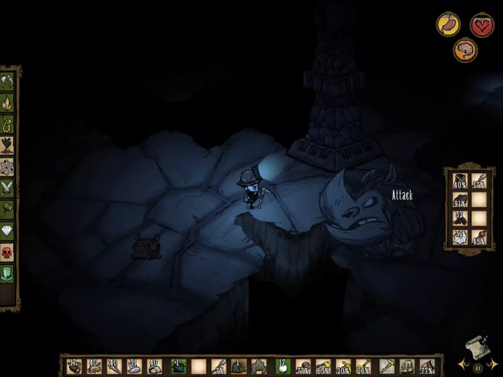 Lá está você começando uma nova aventura em Don't Starve, inúmeras possibilidades de começo, mas de tantas coisas, você acaba se perdendo e tomando as decisões erradas. Neste guia, irei lhe ajudar a tomar as melhores decisões, e mostrar porque certas atitudes podem comprometer sua boa jogabilidade InGame. Estou atualizando esse guia e trazendo informações novas, modificando e excluindo algumas dicas que já estavam desatualizadas. A primeira importancia a ser aprendida é: Levar dano NUNCA é o ideal. Sempre tenha isso em mente. Mas as vezes será preciso levar um ou outro hit de certo mob. O mais correto é alcançar uma jogabilidade que mescle "Proteção e Comida". Anteriormente, eu tinha ensinado que se proteger era bem mais importante do que ficar sentindo fome, porém, com o passar do tempo eu percebi que o o correto é zerar a fome e tomar precaução. Antigamente, era bem mais difícil Atacar certos Mobs, e até mesmo reabastecer alguns itens. Por isso, foi necessário deletar algumas partes e reformular novas estratégias que melhor se encaixam nos novos estilos de jogo. Por exemplo, antigamente era mais difícil reabastecer os Miner Hats, precisando usar ouro e outros vagalumes. Atualmente, basta coletar alguns vagalumes, e ir colocando eles aos poucos enquanto a porcentagem do item desce. Existem também light bulbs, itens encontrados dentro das cavernas que servem como vagalumes, mas dão menos porcentagem. Sem falar que os textos do antigo guia possuiam alguns erros, textos muito cumpridos, e não tinha uma boa referência de como Nomear os Monstros. Bem, eu modifiquei essas coisas para se tornar um texto mais dinâmico e compreensível. Adicionei algumas partes sobre a caverna e as ruínas. Neste guia, eu não vou dar dicas sobre as DLCs "Shipwrecked" e "Reign of Giants". Aproveitem! Algumas Regras de Sobrevivência 1- Digamos que para se segurar por mais tempo, algumas barreiras devem ser quebradas.Don't Starve em certos momentos irá te colocar no limite da Situação: Restar 5 de Saúde, não ter comida, começar a congelar, passar uma noite obrigatória no Pantano, acabar a madeira etc etc etc. O mais importante é aceitar o desafio e colocar uma nova meta: Sobreviver a todo o custo. 2- Para economizar tempo, sempre tenha objetivos, uma espécie de Missões a serem feitas, como exemplo, "Criar um Caldeirão" ou "Pegar uma engrenagem urgente". Além de economizar o tempo, essas metas lhe farão adquirir uma mobilidade maior pelo jogo, ao invés de te deixar na base pensando em coisas do tipo: "O que vou fazer agora?" ou "Deixa eu ver o que eu tenho no Báu". Enfim, criar metas o fará ser prático. 3- Tenha sempre um mecanismo de ressurreição, como os Bonecos de Madeira ou amuletos, pois com certeza, uma hora ou outra, tudo irá conspirar para as coisas darem erradas, e você morrer. 4- Configure em seu Menu para atacar com uma determinada tecla. Ficar atacando com cliques é bem mais difícil. 5- Sempre faça as perguntas: "Vale a pena?", "Valeu a Pena?" e "Valerá a pena?" 6- Organize seu inventário de modo que você se sinta confortável. Ter um Inventário desorganizado lhe tira a concentração e a dinâmica ágil de jogo. Escolha lugares no seu inventário para colocar determinados itens, e os memorize ali. No jogo, existe uma mecânica de switches (trocas de itens) que possibilita você usar itens de forma rápida, trocar de itens na mão, e realocar da mão para o inventário, vice versa. Eu, por exemplo, gosto de separar meus recursos das comidas e dos outros itens, como machados, lanças, picaretas etc. Sobrevivendo aos 10 primeiros dias O personagem que eu mais aconselho se estiver começando, é justamente o Wilson, pois ele possui uma mecanica simples, a barba dele protege um pouco mais do frio que o normal, e após a barba ser retirada, ela recupera sanidade e pode ser utilizada para construir a meat effigy (Que ressuscita o personagem no local que foi construída após alguma fatalidade). Você começa no meio do nada, e possui apenas 8 minutos por dia. Uma forma de se sair muito bem no seu primeiro dia é conseguir coletar o máximo de palha, gravetos, cenouras, frutos, flint (Pedra menorzinha) e madeira. Começar bem o primeiro dia, tanto no survival quanto no adventure, irá driblar problemas futuros. Tente coletar até fechar um Pack de item completo de cada um, ou seja, 20 madeiras, 40 palhas, 40 gravetos, 40 flints. Após coletar esses itens iniciais, seu próximo passo deve ser coletar ouro. O ouro pode ser encontrado: soltos perto de um cemitério, escavando as tumbas com uma pá e dando o loot para o Rei dos Porcos, quebrando itens com um martelo que possuem ouro na sua construção, destruindo as Rochas de Ouro, pegando dentro das cavernas em rochas ou quando caem após terremotos. A forma mais fácil de conseguir ouro é minerando das Rochas. As rochas possuem pequenas pepitas douras, não são muito dificeis de serem diferenciadas das outras normais. Nessa fase, você precisa de pelo menos 7 ouros. Se no seu mapa, você deixou padrão ou colocou para ter inverno, então seus próximos objetivos devem estar relacionados a conseguir meios de sobreviver no frio. As melhores formas de se sobreviver no frio é construir uma base, com fogueira de pedras (12 pedras), uma crock pot (9 pedras, que precisam se transformam em 3 pedras refinadas), casaco, gorro, e uma Thermal Stone. Por que? Com a crock pot você conseguirá deixar a comida "descansando", em outras palavras, ela ficará dentro da panela sem perder sua validade (Em testes, mesmo passados 100 dias, a comida não perdeu a validade. Ou seja, a comida pode até deteriorar, mas levará muito tempo). Com a fogueira de pedras você irá apenas gastar madeira, ou esterco, ou qualquer outra coisa que queime para ligá-la, sem precisar gastar palha todas as vezes que necessitar de fogo. O Thermal Stone é o item mais importante para o inverno, pois consome apenas um espaço no inventár