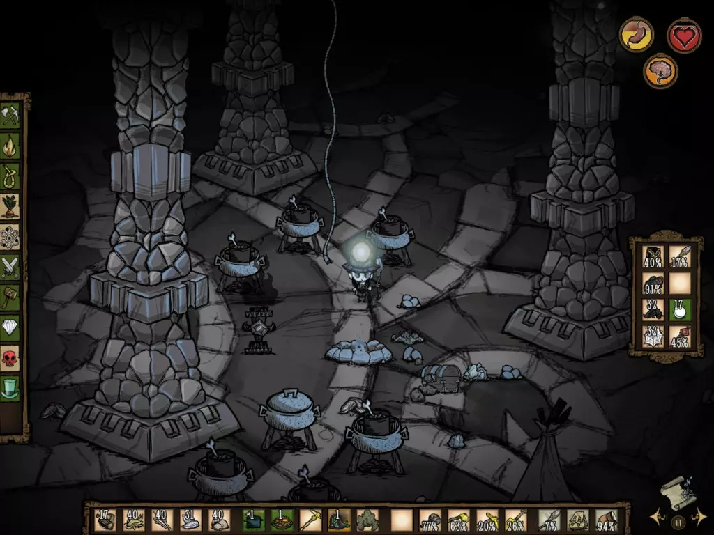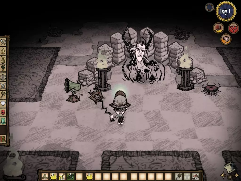 我建议你制作多个牙齿陷阱,放在开阔且没有易燃物的地方。一旦听到咆哮声,就赶紧跑到牙齿陷阱群的正中央。时间久了,你就会明白我的意思。这里有个重要提示,要学会使用“浆果帽”。当猎犬即将到来时躲起来,就能驱散它们,它们不会发现你,转而攻击附近的其他生物。但要注意,只要你的角色说出任何话,比如“天色已晚”“我听到狗叫声了”“我只有50%的饱食度了”……你就会从隐藏状态中暴露出来。 好了,这些应该能让你在游戏中存活很长一段时间了。但还有一个秘密:一定要建造一些肉像。为此,你必须学会操控暗影物品。没有人是铁打的,有时候,任何细节都可能是残酷的。所以不要奢望自己能永远“安然无恙”地游戏。 疯狂物品与魔法力量 假设你不想失去自己创造的世界。那么,对你来说,理想的做法就是制作肉像(Meat Effigy)并找到复活石(touch stones,一种在你死亡时将你复活但随后会被摧毁的结构)。 如果你使用的不是威尔逊角色,就必须将你的理智值降至80以下(具体数值取决于角色,甚至可能更低)。如何简单降低理智值 1) 当夜幕降临时,远离火源,直到理智值指针大幅向下(注意不要离得太远而被攻击) 2) 靠近怪物并与它们战斗。 3) 烹饪(或不烹饪)怪物肉并食用(你也会损失少量生命值) 4) 食用生肉。 5) 跳入虫洞。 6) 不要建造任何东西,因为学习新技术会增加理智值。 7) 不要穿戴恢复理智值的衣物,如帽子、外套、贝雷帽。 8) 食用生的绿蘑菇(最推荐,因为速度更快)。 9) 靠近恶性花朵,采集它们或食用它们 10) 不要使用任何蓝图,因为会恢复理智值。好的,现在你既然知道如何降低理智值,就必须前往一片沼泽场景,或者某个有很多兔子洞的地方。到达那里后,你会心想:“天啊,这是什么鬼丑怪物?”这正是理智值恶化后产生的产物。但那又怎样呢?要想获得“胡须”道具,你就需要杀死这个怪物。