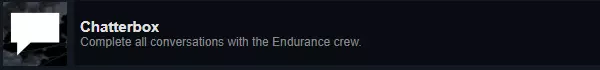 成就:Chatterbox 说明:和所有坚忍号船员对话。