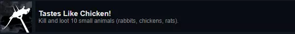 成就:Tastes Like Chicken! 说明:猎杀并获取10只小型动物(例如兔子、鸡、老鼠)的资源