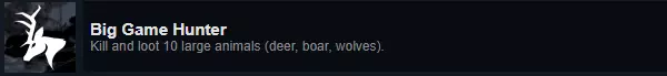 成就:Big Game Hunter 说明:猎杀并劫掠10只大型动物(例如鹿、野猪)