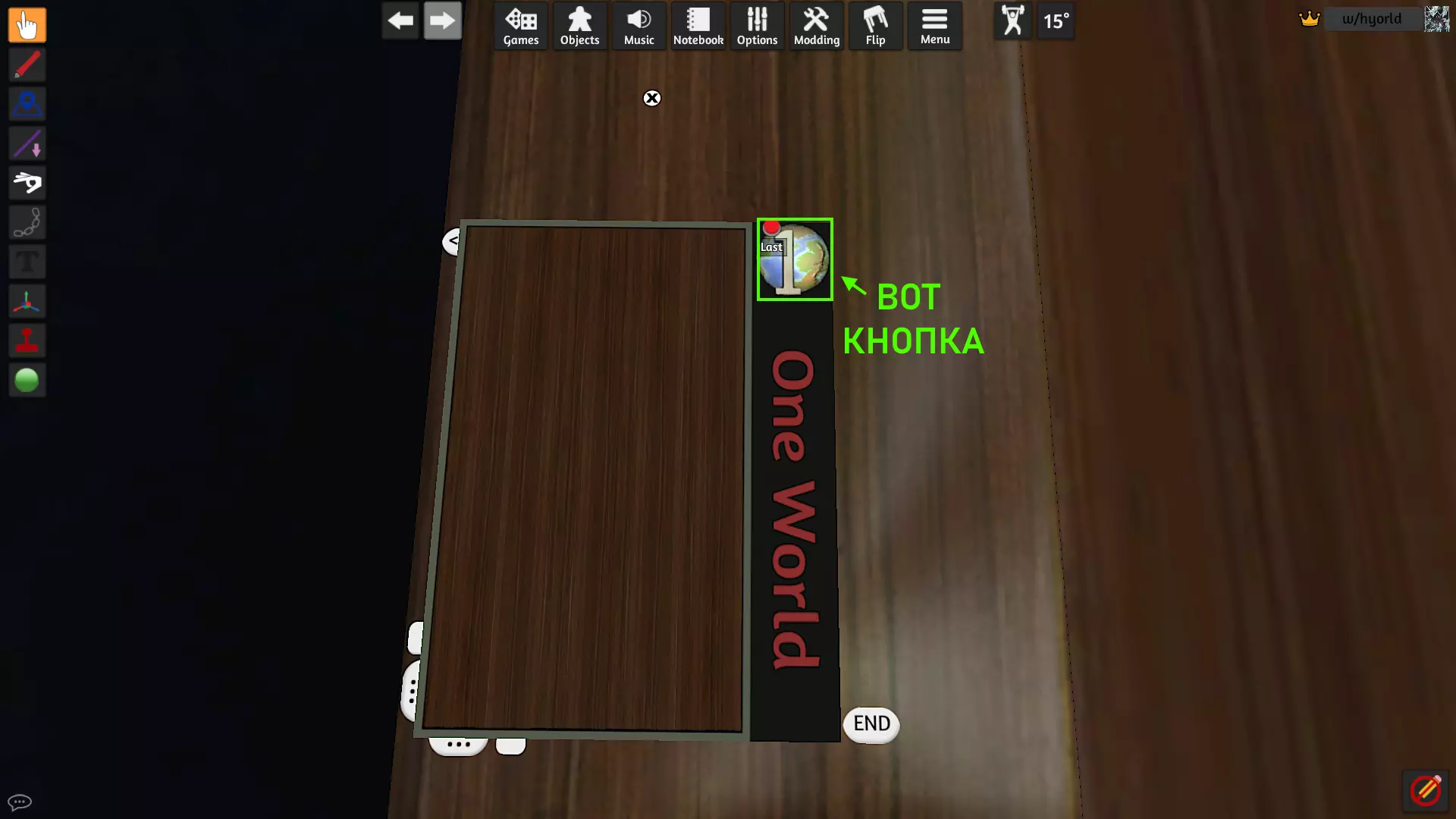 - “复制”按钮会创建当前卡片的令牌副本。 - “删除”按钮用于删除当前卡片。**注意**:首次上传的卡片无法删除,若该卡片因某些原因不符合您的要求,您可以通过“编辑”按钮对其进行修改。 - 现在来了解左下角的按钮。 - “FitFrame”/“重置”按钮的功能您已了解,即调整比例或取消调整。 - 接下来是两个按钮“...”两者都将卡牌旋转180度,一个沿垂直方向,另一个沿水平方向。 之后是一个空白按钮,或者带有“*”符号的按钮。如果没有该符号,则卡牌显示在游戏桌面上;如果按下该按钮,卡牌将从游戏桌面上隐藏,十分方便。然后是右上角的按钮,就在OneWorld标志的位置。数字“1”左侧的按钮会打开您之前打开过的最后一张地图,右侧的按钮则会打开下一张地图。要打开该地图,请点击红色的地图名称文字。那么这个菜单中的最后一个按钮位于右下角,名称为“CLR”,我理解这表示“清除”。实际上,这个按钮的作用就是移除当前地图,为你打开一个干净的面板屏幕,你可以在其中像之前那样加载新地图:点击打开菜单的按钮,再点击“New”按钮,生成令牌,加载图片,修改名称,然后将其拖到面板上。就是这样!我忘了说明,每当你加载新的卡牌令牌时,系统会同时创建一个快速跳转到该卡牌的令牌。 基本上,当你处于空白卡牌界面时,右下角只会剩下“END”和“LOCK”按钮。其中,“END”按钮用于关闭脚本,“LOCK”按钮则用于启用脚本。 我没有更多内容要告诉你们了,希望我写的内容清晰易懂。祝大家好运,游戏愉快!