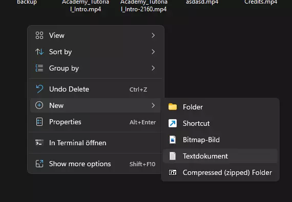 2 - 创建一个备份文件夹,并将“intro.mp4”和“Startup_Sequence_Loading.mp4”拖入该备份文件夹中。 3 - 现在在主视频文件夹中右键点击,创建一个如下所示的文本文件:
