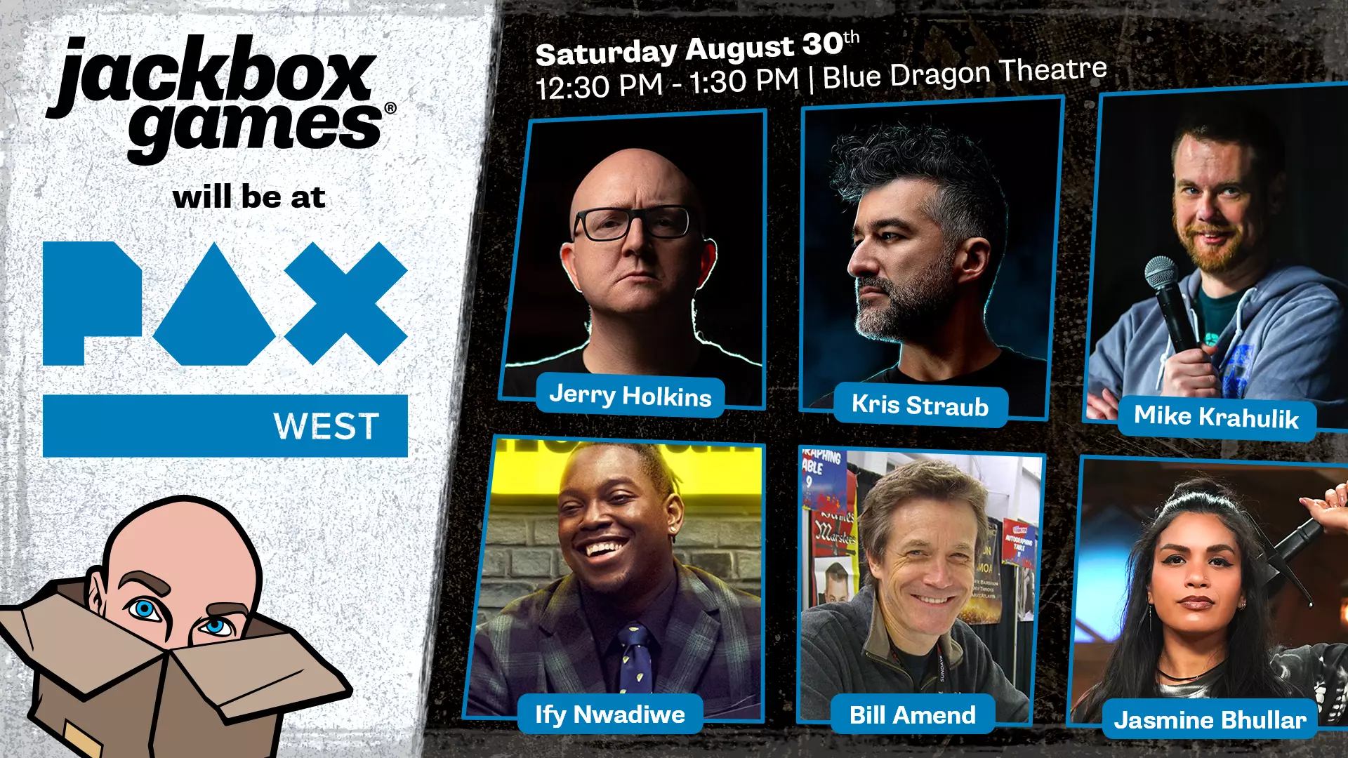 你好,西雅图!我们本周末将前往参加2025年PAX West游戏展。你可以在展会上试玩游戏、赢取奖品、观看有趣的座谈会,还能购买全新的珐琅徽章。 在哪里以及何时能看到Jackbox的座谈会? Jackbox Party PAX 1:初次登场 时间:太平洋时间8月30日(周六)中午12:30 - 下午1:30 地点:蓝龙剧院 内容:观看有趣的嘉宾们游玩一些玩家喜爱的Jackbox游戏,以及《派对游戏包11》中尚未发布的游戏 嘉宾:包括Jerry Holkins、Mike Krahulik、Ify Nwadiwe、Bill Amend、Kris Straub、Jasmine Bhullar和Anna Prosser Jackbox Party PAX 2:回归老本行 时间:太平洋时间9月1日(周一)下午2:00 - 3:00 地点:蓝龙剧院 内容:充满抢先体验内容的座谈会!观看风趣的嘉宾们试玩《派对游戏包11》中三款尚未发布的游戏 嘉宾包括:杰瑞·霍尔金斯、克里斯·斯特劳布、凯特·韦尔奇、山姆·温克勒以及安娜·普罗瑟