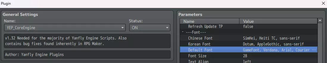 这样,你的项目将自动读取此文件作为默认字体。 #3 - 如果你正在使用YEP_CoreEngine 部分插件可能会干扰MV的默认字体系统。例如:对于YEP_CoreEngine,你需要修改该插件的参数才能让新字体生效。