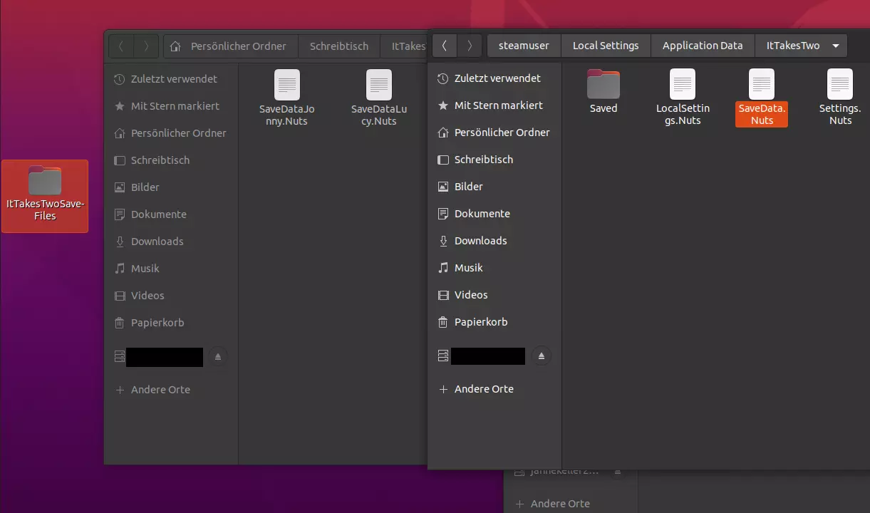 嘿!我想和两位朋友同时玩《双人成行》。我的问题是没办法同时保存两个不同的游戏进度。虽然可以选择章节并从那里继续游戏……但这对我来说不太方便,因为我不想重复游玩我和朋友们已经玩过的部分。 经过几个小时的摸索,我找到了一个解决办法。不过我不建议尝试,因为它和选择章节继续游戏后重复游玩部分内容一样不方便。尽管如此,我还是想分享一下这个方法。也许你们中有人实在没办法,会想用它。 1. 开始游戏。 这一步合乎逻辑且简单。先和你想一起玩的朋友开始游戏。花几个小时一起游戏,了解合作(CO-LA-BO-RATION)的重要性。完成游戏环节后,继续游玩直至看到右下角出现自动保存图标。 之后你就可以关闭游戏了。 2- 找到存档文件夹。 现在你需要找到存档文件夹。具体位置如下方图片所示。