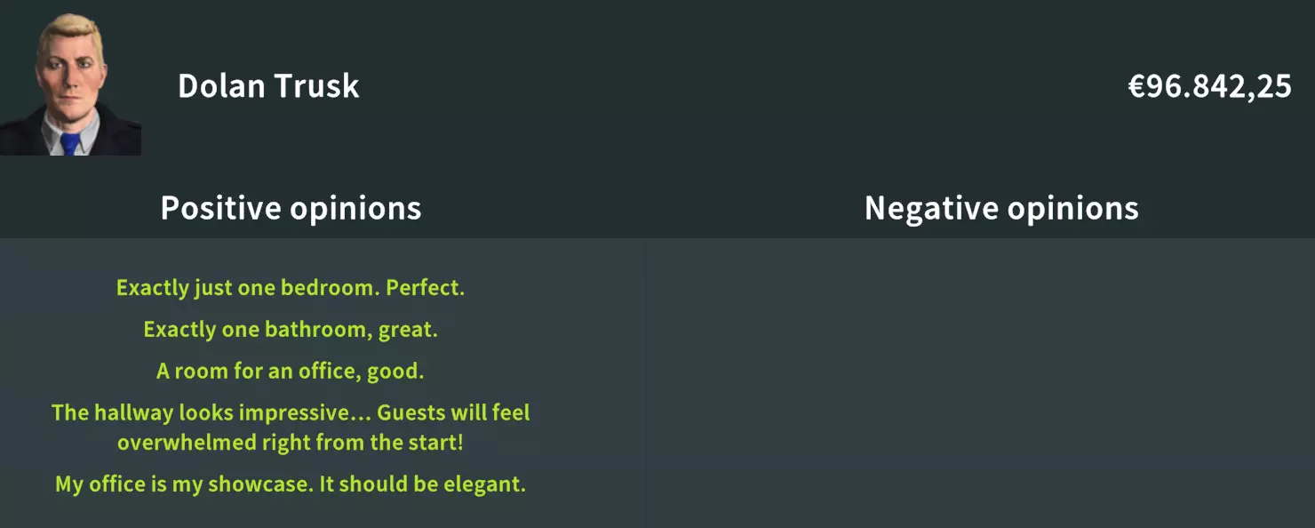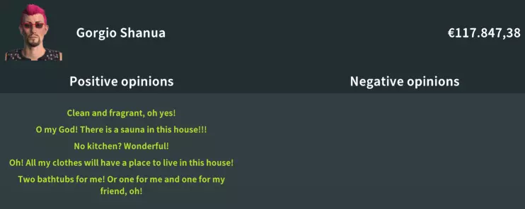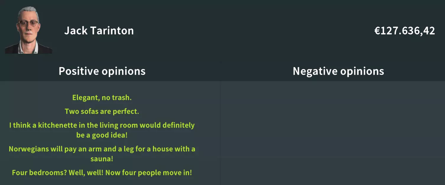 这位买家特别喜欢粉色系的物品,以及衣帽间和浴缸。 浴室要求:要满足这位买家,你需要配备一间浴室,但别忘了必须要有两个浴缸。这是让他们满意的关键。 衣帽间与衣柜需求:此外,确保设置两个带有足够衣柜的衣帽间。拥有两个衣帽间对于完全满足他们的需求至关重要。而且,桑拿房也是让他们开心的必备设施。 无需厨房:令人惊讶的是,这位买家对厨房毫无兴趣,所以可以不用设置。 床:我尝试了很多种床,但只有一种能避免出现红色的“不喜欢”标识:一间宽敞的主卧室会非常有帮助。 新涂料:粉色系涂料(我选择了“脏粉色”)。 新地板:不需要。 房间:2个衣帽间。