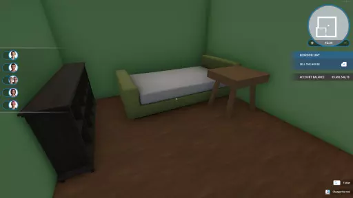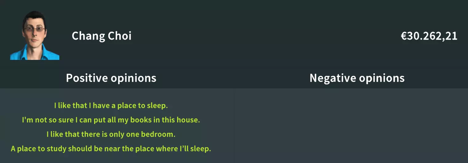 这个成就无疑是最难获得的成就之一。想要提高成功几率,可以考虑把你最小的房产留给这位买家。 温馨提示:除了为了达成成就外,选择这位买家几乎没有其他理由,因为利润率并不高。 根据我的经验,“平房”是完成这个成就的理想房产,但任何小面积的空间都可以。 新涂料:绿色系涂料(我选择了“青柠色”)。 新地板:无需更换。 书桌需要靠近床。 房间:1间卧室(26平方米) 维恩卧式书柜 螳螂单人床 贝斯kit 75厘米B款书桌