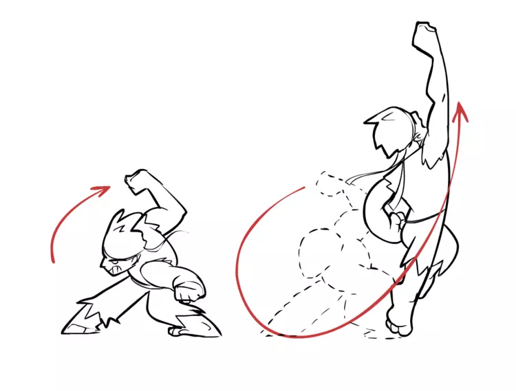 大多数自然动作都是以圆周运动的方式进行的。手部或头部的动作不会是直线移动,而是呈弧形曲线。然而,机械角色的动画通常不会加入弧线,以此来达到那种机器人的效果。 次要动作