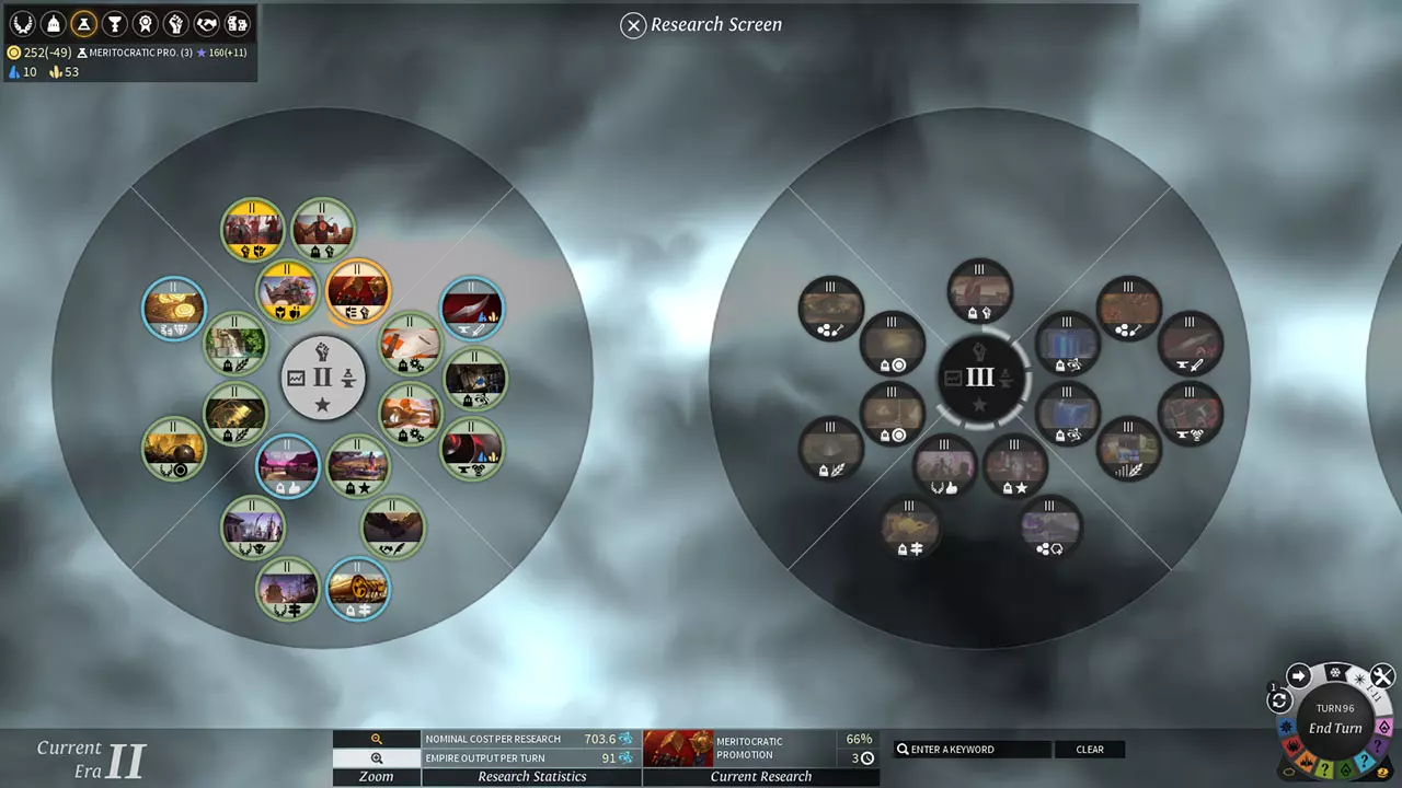 要激活增益效果,只需点击周围有黄色方框的奢侈资源。增益效果将持续10回合。 科技 《无尽传奇》采用了一种新颖的技术进步机制。该系统旨在提供最大的自由度,并迫使玩家做出真正的选择。让我们来看看他们是如何实现这一点的。 摆脱时代与象限限制 所有科技分布在六个时代中。每当你解锁一个时代,游戏就会发生一些变化。你的军队将获得新等级的武器和护甲。 新训练的单位将拥有更多经验值,但生产成本也更高。 新的帝国计划等级将解锁(最高4级)。 地图上会显示新的战略资源或奢侈品资源。 每个时代的科技分为四个象限: - 军事 - 科学与工业 - 帝国与扩张 - 经济与人口 不过这种分类只是为了方便你查看。所有科技都可以按任意顺序研究,没有固定路径!因此,一旦某个时代解锁,你就拥有完全的研究自由。