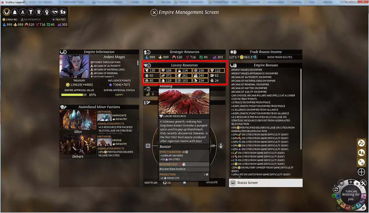 战略资源共有多少种?战略资源分为六种,分属三个不同的等级。科技时代3将解锁2级采集器,科技时代4将解锁3级采集器。 1级:玻璃钢(黄色)和钛(蓝色)。 2级:阿达曼合金(橙色)和钯金(红色)。 3级:超铀(紫色)和秘银(绿色)。 这些战略资源有何区别?更高等级的资源能让你建造更高级的装备。同一等级内的资源属性大致相当,但各有侧重。例如,玻璃钢武器往往拥有更高的 initiative,而钛制武器则提供更高的攻击评级。请记住,更高等级的采集器建造成本更高。关于战略资源需要了解的重要事项: - 单个采集器每回合将为你提供+1战略资源,因此你需要一段时间才能购买装备。 - **冬季不会产生任何战略资源(除了Vaults势力)** - 你可以囤积战略资源(最多999个) - **用战略资源购买护甲/武器是一次性费用,而非《文明5》中那样的永久性维护费用。** - 你也可以从市场购买战略资源 - 你可以与其他玩家交易战略资源 奢侈品资源和增益效果 奢侈品资源在《无尽传奇》中极为重要,但很容易被忽略。它们能为你的帝国带来巨大收益,尤其在支持度(幸福度)方面。### 奢侈品资源 除战略资源外,地图上还分布着奢侈品资源节点。与战略资源类似,这些资源可通过采集器和城市区域进行采集。一旦建造采集器,你将开始囤积这些资源(每个采集器每回合+1)。 ### 增益效果 若收集到足够数量的同类型奢侈品资源,即可消耗它们来获取增益效果。增益效果因奢侈品资源类型而异。消耗数量取决于玩家控制的城市数量:帝国规模越大,消耗成本越高!