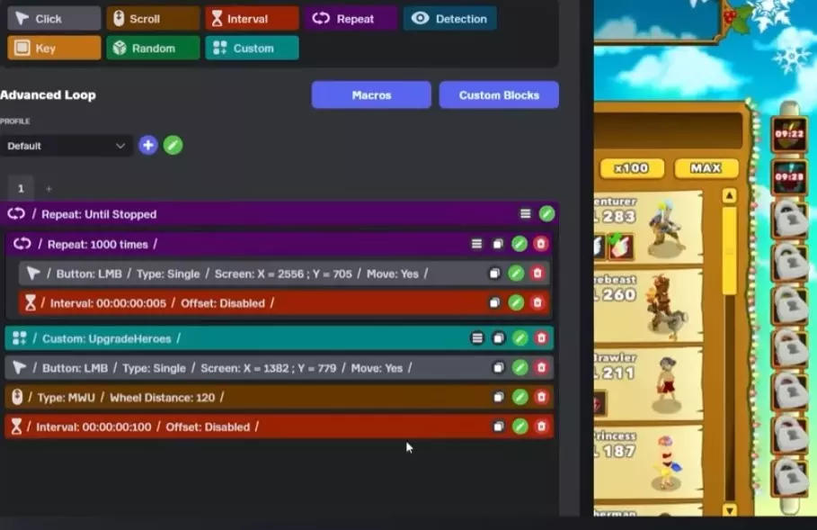 邦戈猫 邦戈猫能检测快速且时机精准的“按键按下”和“按键释放”事件。我尝试了高级模式、橙色的按键组件、100毫秒的按键按住时长并带有随机偏移,再加上500毫秒的间隔组件,但仍然无法正常工作……也试过50毫秒的按住时长以及按键间隔50毫秒,邦戈猫还是无法识别这些点击,不清楚原因。 点击英雄 与邦戈猫类似,它有用于检测自动点击的代码。根据某个帖子,开发者回应称——将点击类型设置为按住,按住时长15毫秒,间隔25毫秒,因为它无法识别快速点击。我还没尝试过。《细胞到奇点》 根据某篇讨论帖,开发者已确认自动点击器在本游戏中无效。 多屏幕与多任务处理: - 禁用“移动光标”选项——执行点击操作时不会移动光标。 - 降低点击速度并设置更长的间隔,有助于解决光标冻结问题。 那么,它是否是一款适合多任务处理的桌面辅助工具,且易于使用呢? 这款自动点击器在屏幕上占用空间较大,无法像《Cookie Clicker》那样调整为任意大小和形状。不过,一旦设置好循环以及开始/结束循环的快捷键后,自动点击器窗口可以最小化。 其他方面: 我真的希望能有一份关于如何为游戏设置自动点击器的指南。我在此处的贡献非常有限。实用链接(从开发者帖子中复制) 测试网站:https://www.rapidtables.com/tools/click-counter.html 官方Discord:https://discord.gg/hBapHvZDJ7 YouTube播放列表:https://youtu.be/r3-cR6Xju_A?si=KUWvSNyrjLmExfoY 问题 - 哪些游戏适合搭配这款自动点击器使用?最佳设置是什么(欢迎分享截图)? - 是否有良好的多任务设置方案?例如,自动点击器处理《Cookie Clicker》和Bongo Cat,同时用户仍能使用鼠标进行其他操作? Microsoft OP Auto Clicker 4.0是免费软件,具备光标位置选择、随机偏移、录制与回放功能。如果你的目标是在《Cookie Clicker》中点击饼干,这款免费的OP Auto Clicker完全能胜任。不过,免费应用不具备颜色检测、图像检测、宏以及高级循环模块功能。高级循环几乎可适用于任何场景。 以下是《Playsaurus 自动点击器》预告片的截图。