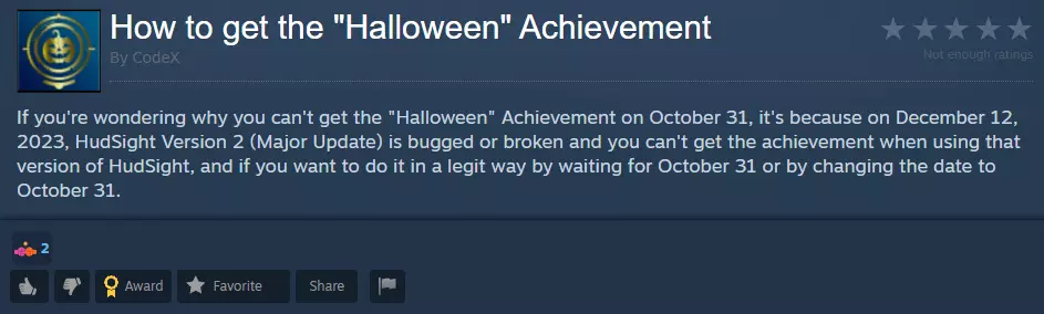 (更新:此漏洞已修复。)如果你想知道为何在10月31日无法获得“Halloween”成就,原因是在2023年12月12日发布的HudSight 2.0版本(重大更新)中存在漏洞或故障。使用该版本的HudSight时无法获得该成就,若你想通过正当方式获取,需等到10月31日或手动将日期修改为10月31日。 更新 此漏洞已修复。