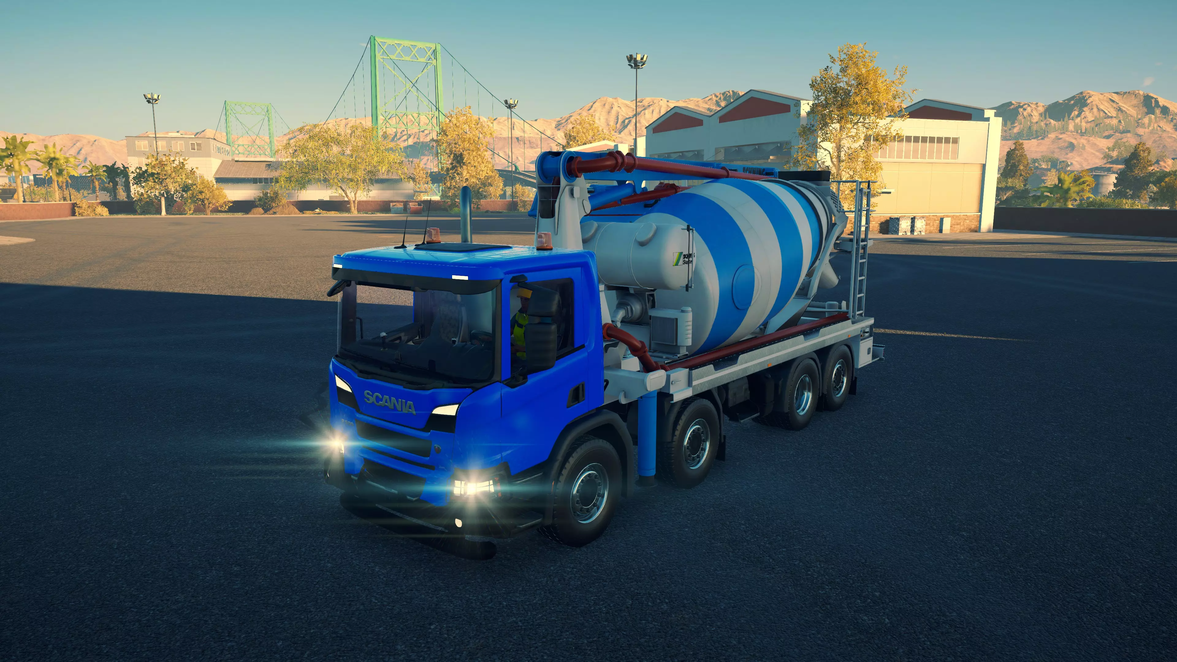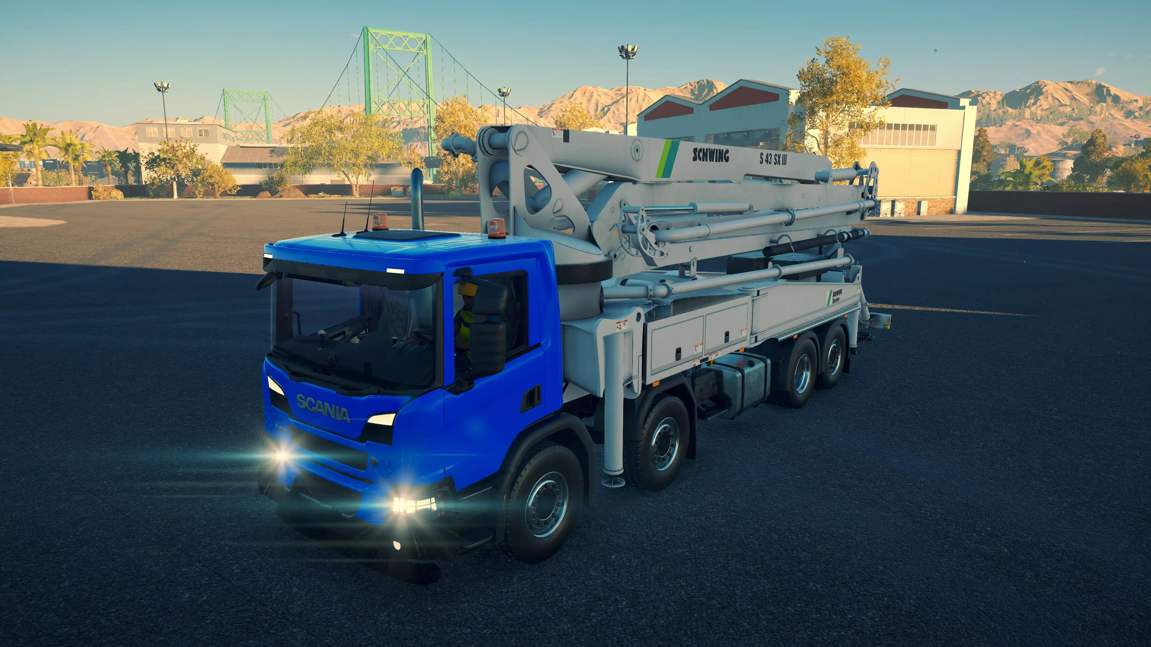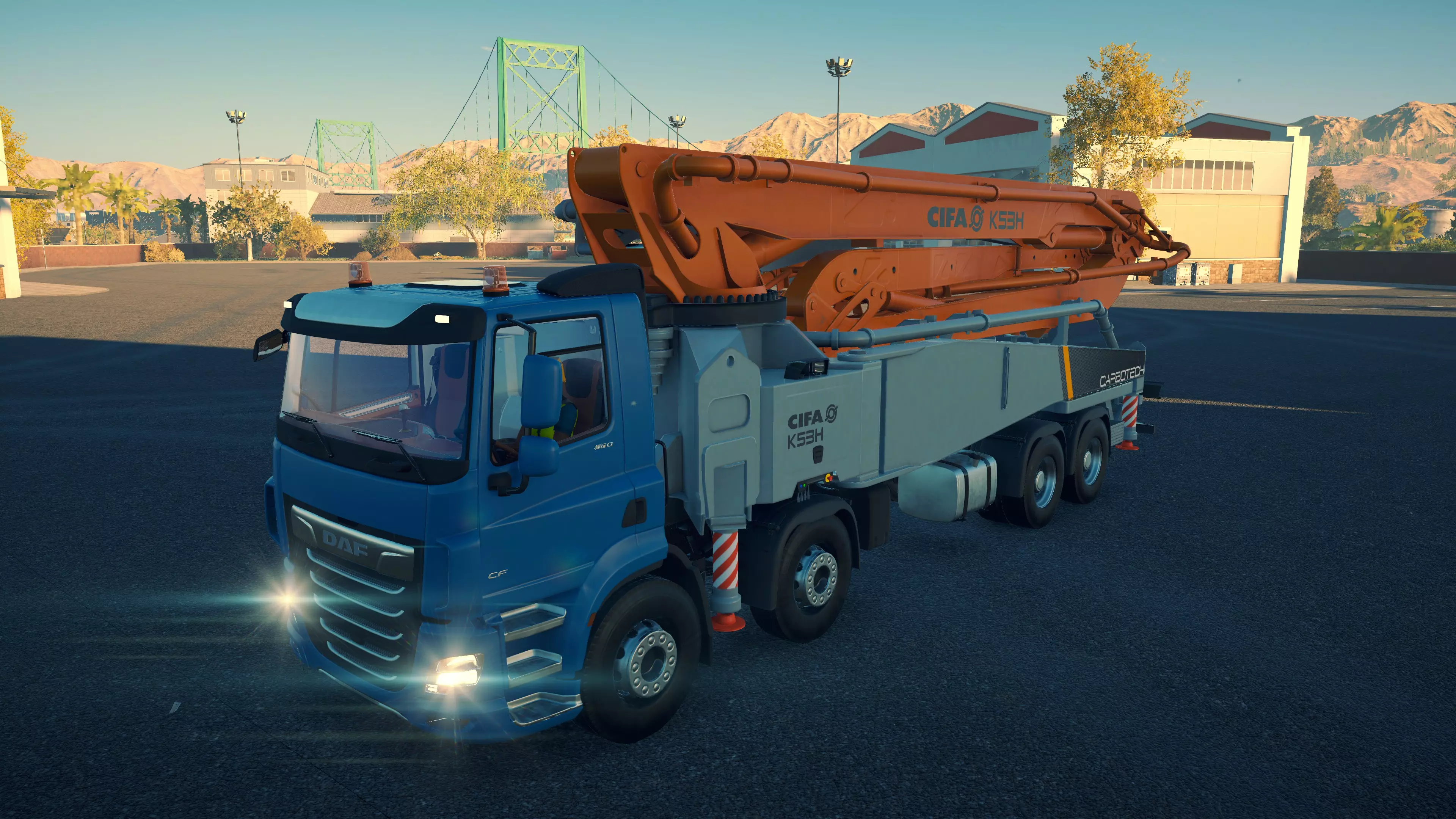 DAF CF 430 FAC 8X2/CIFA MK25H Carbotech 购买/租赁 - 180,000美元/3,600美元 长度 - 9.88米 宽度/带支架 - 3.02米/4.2米 高度/带支架 - 3.88米/4.02米 转弯直径 - 18米 最高速度 - 88公里/小时/14公里/小时 加速性能 - 10.2秒内加速至60公里/小时 最大臂架长度 - 20米 散装物料容量 - 35立方米+1立方米 压力测试 - 2分02秒 混凝土泵 选择混凝土泵时,首要考虑因素是臂架的作业范围。因此,DAF显然是最佳的混凝土泵,尤其是它还是价格较低的型号之一。不过,它的机动性最差,且需要大量空间进行 setup。斯堪尼亚(Scania)的臂架比曼恩(MAN)更长,而且价格更低,setup所需空间也更小,实际上是所有混凝土泵中所需空间最小的。马克卡车与曼恩沥青卡车并列游戏中最快的卡车,不过倒车时速度稍慢一些。除此之外,没有任何理由能证明多花20,000美元是值得的。斯堪尼亚和达夫是最佳的混凝土泵车。