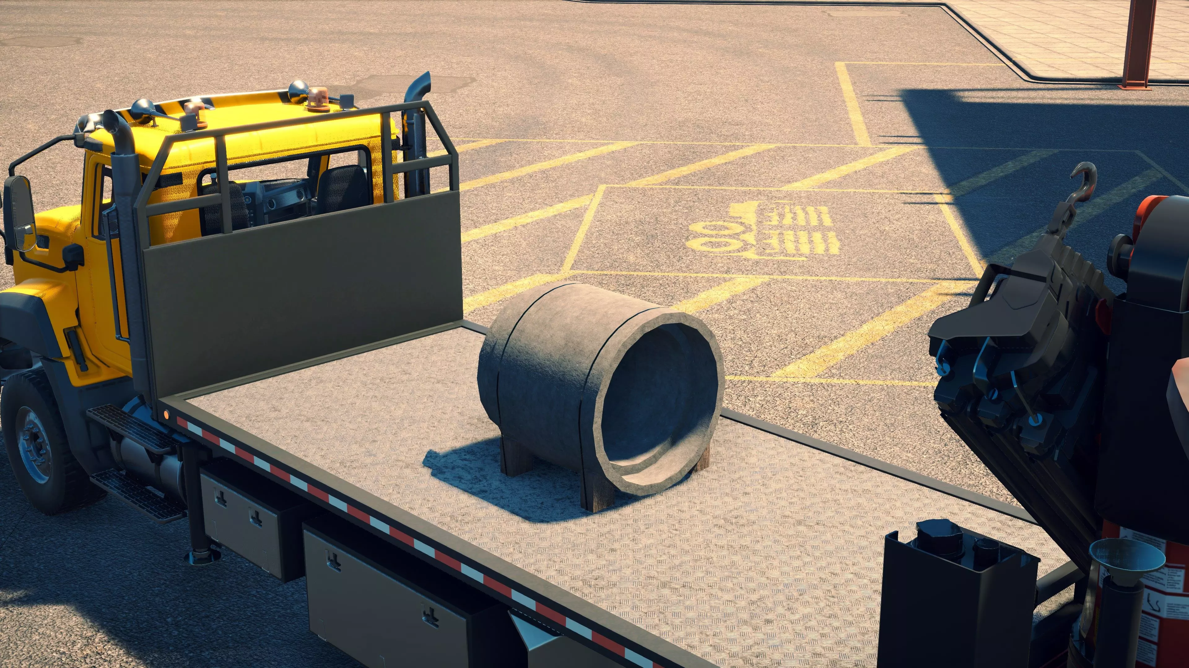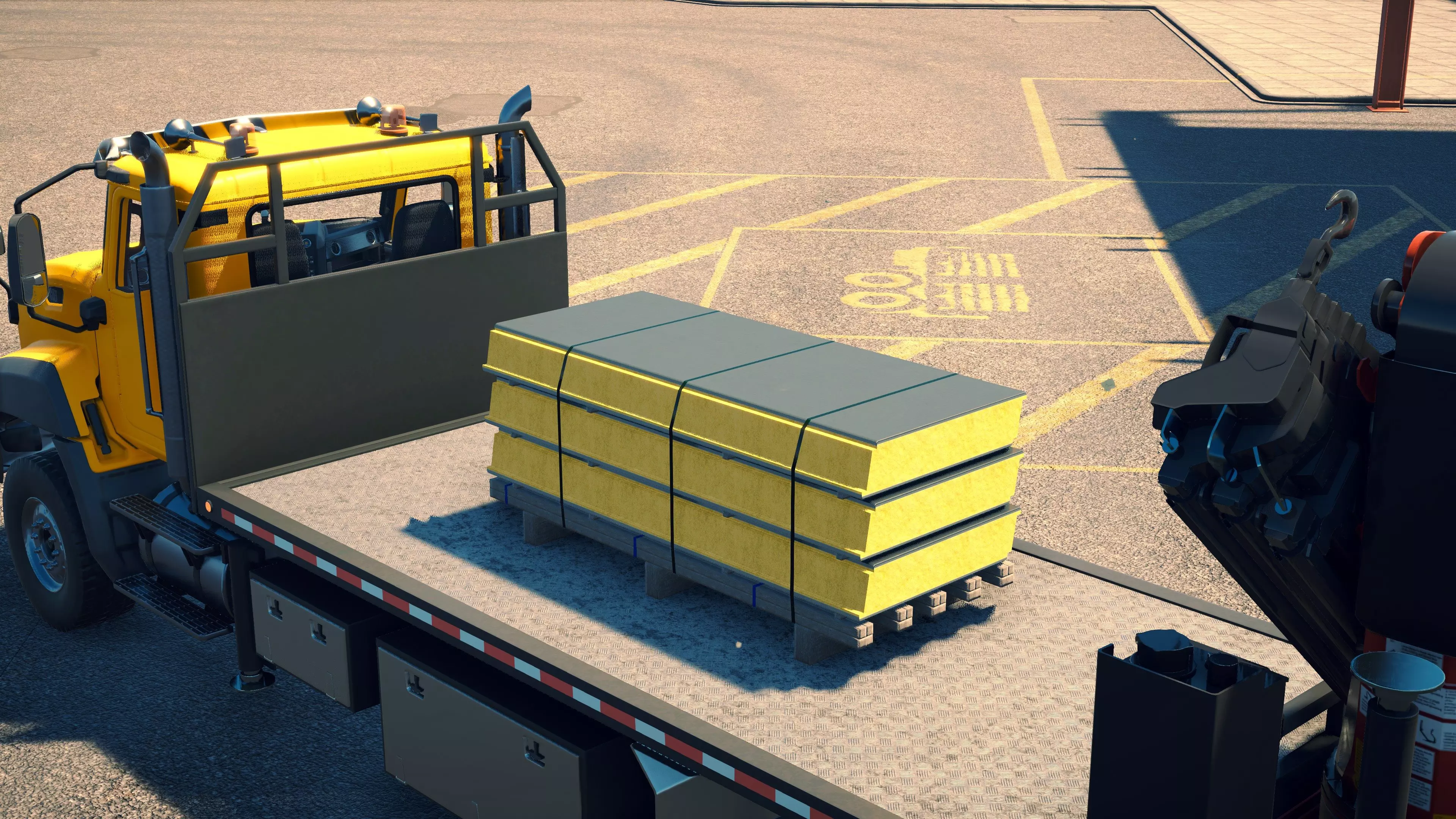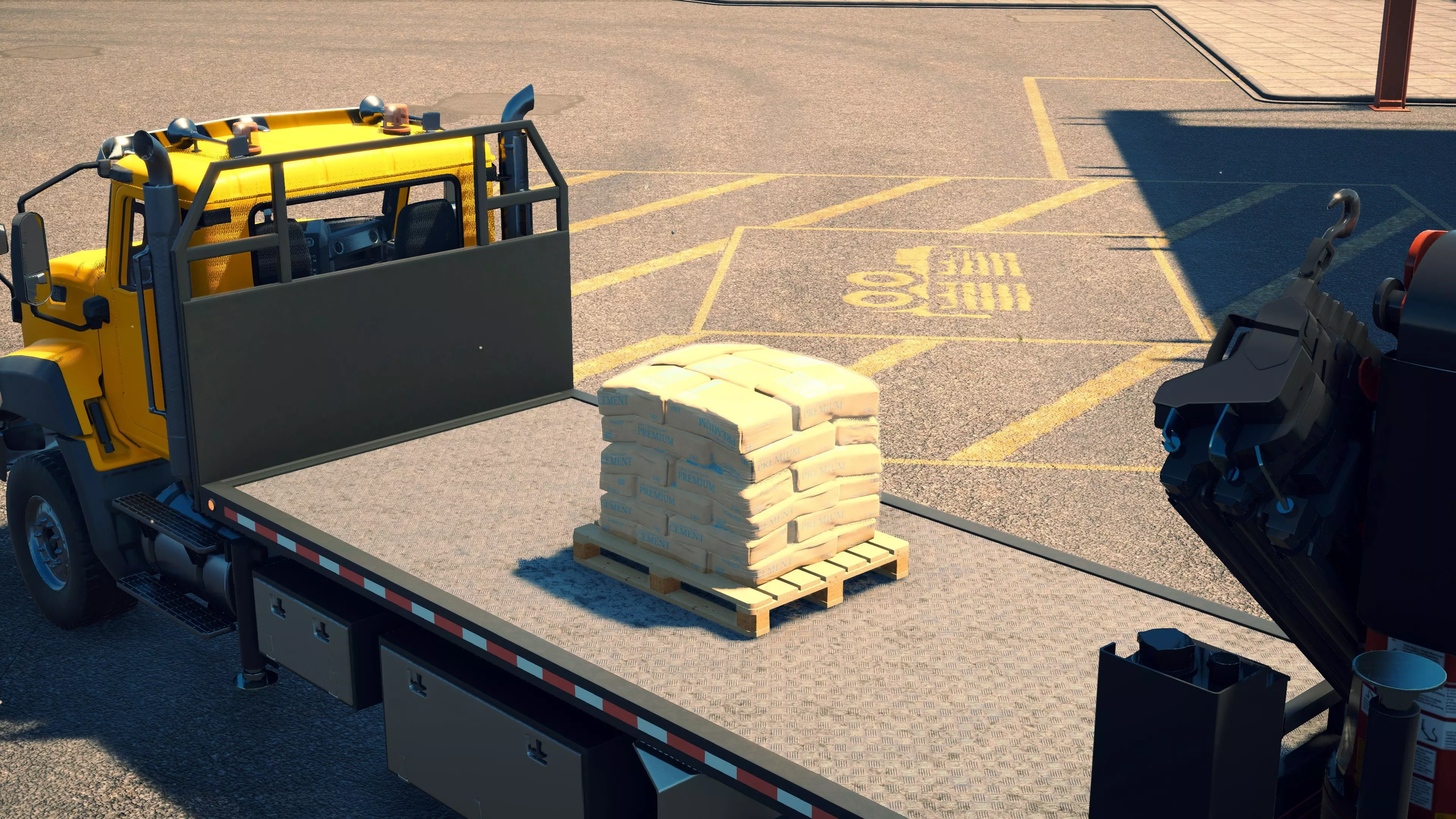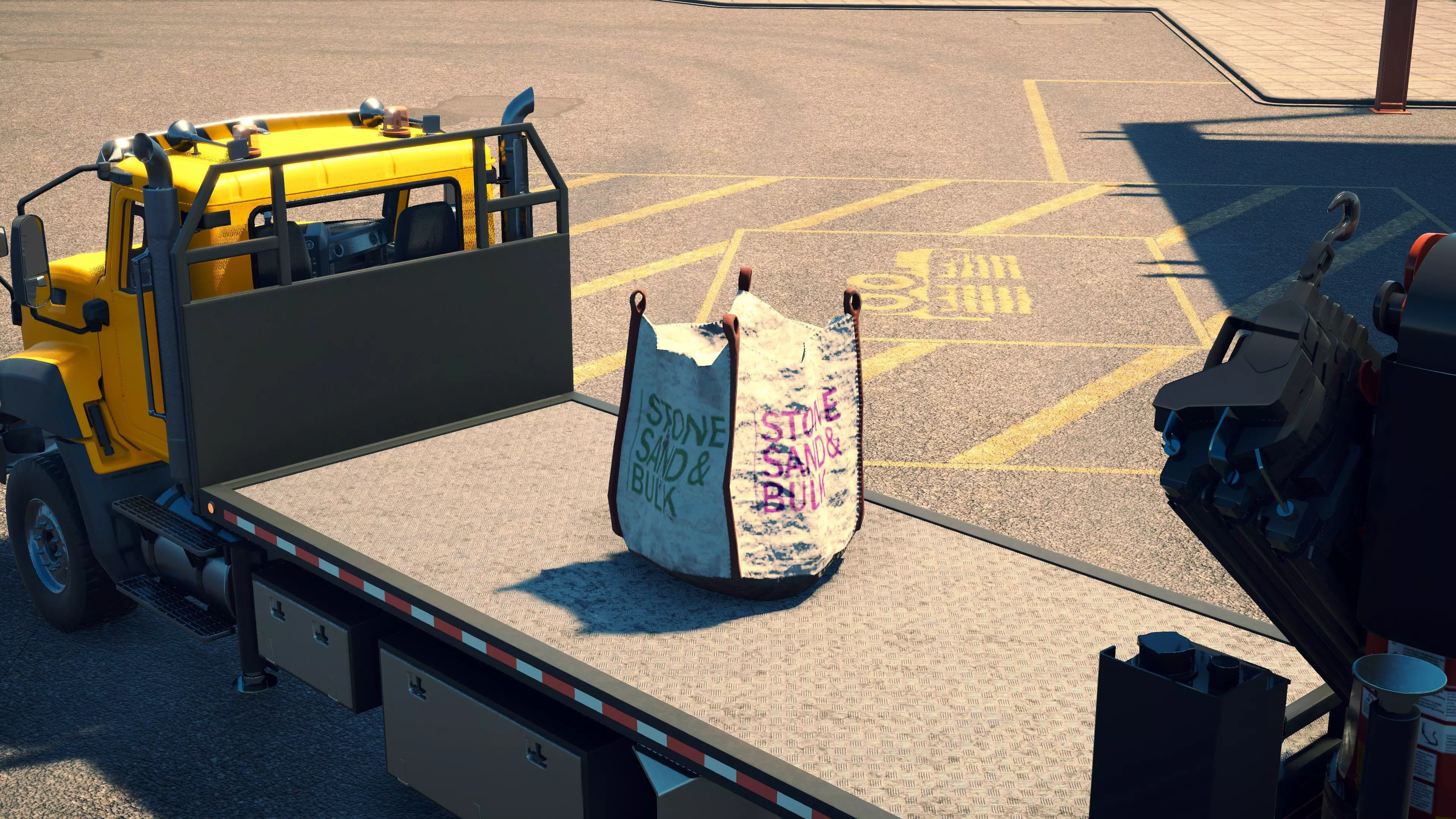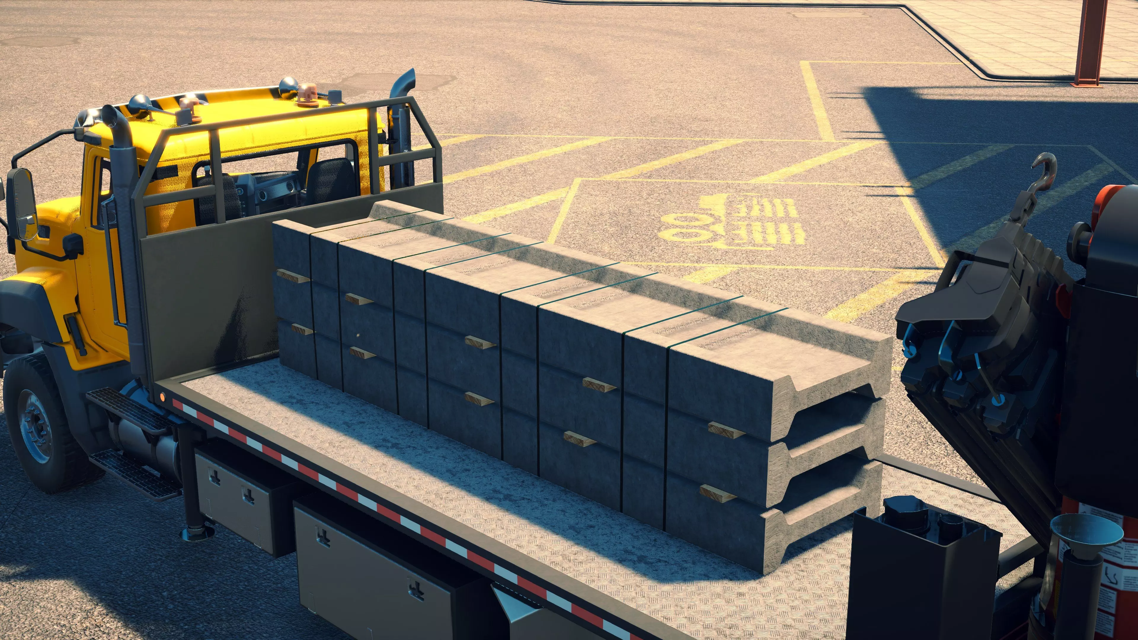 MAN TGS/帕尔芬格 PK 27002/迈勒 D316 购买/租赁 - 100,000美元/2000美元 长度 - 8.26米 宽度/带支架宽度 - 2.92米/5.36米 高度/带支架高度 - 3.66米/3.7米 转弯直径 - 17米 最高速度 - 93公里/小时/14公里/小时 加速度 - 10秒内达到60公里/小时 货舱(单位) - 21长/10宽/10高(4.2米/2米/2米) 散装物料容量 - 8.22立方米 压力测试 - 2分00秒 起重机最大作业半径 - 16米 最大吊钩高度 - 19.5米 360度旋转时间 - 13.5秒 起重机展开/折叠时间 - 10.5秒 起重机伸出/缩回时间 - 13秒 起重等级 - A 可以说,这是两款平板起重机中更出色的一款。其最高速度和加速度几乎相同,上坡时能更好地保持速度,不过更容易失去牵引力。正如你对平头驾驶室车型的预期,它体型更小,转弯直径也更紧凑。它也配备了相同型号的起重机,但这辆卡车真正的优势在于其运输散装物料的能力,这足以弥补货厢面积较小的不足。其装载量超过肯沃斯T880自卸卡车的40%,这一优势不容小觑。当然,一旦拥有了专用的自卸卡车,你就不会再想用它了。但在初期,当你需要充分利用现有资源时,它的多功能性非常突出。 带起重机的拖拉机