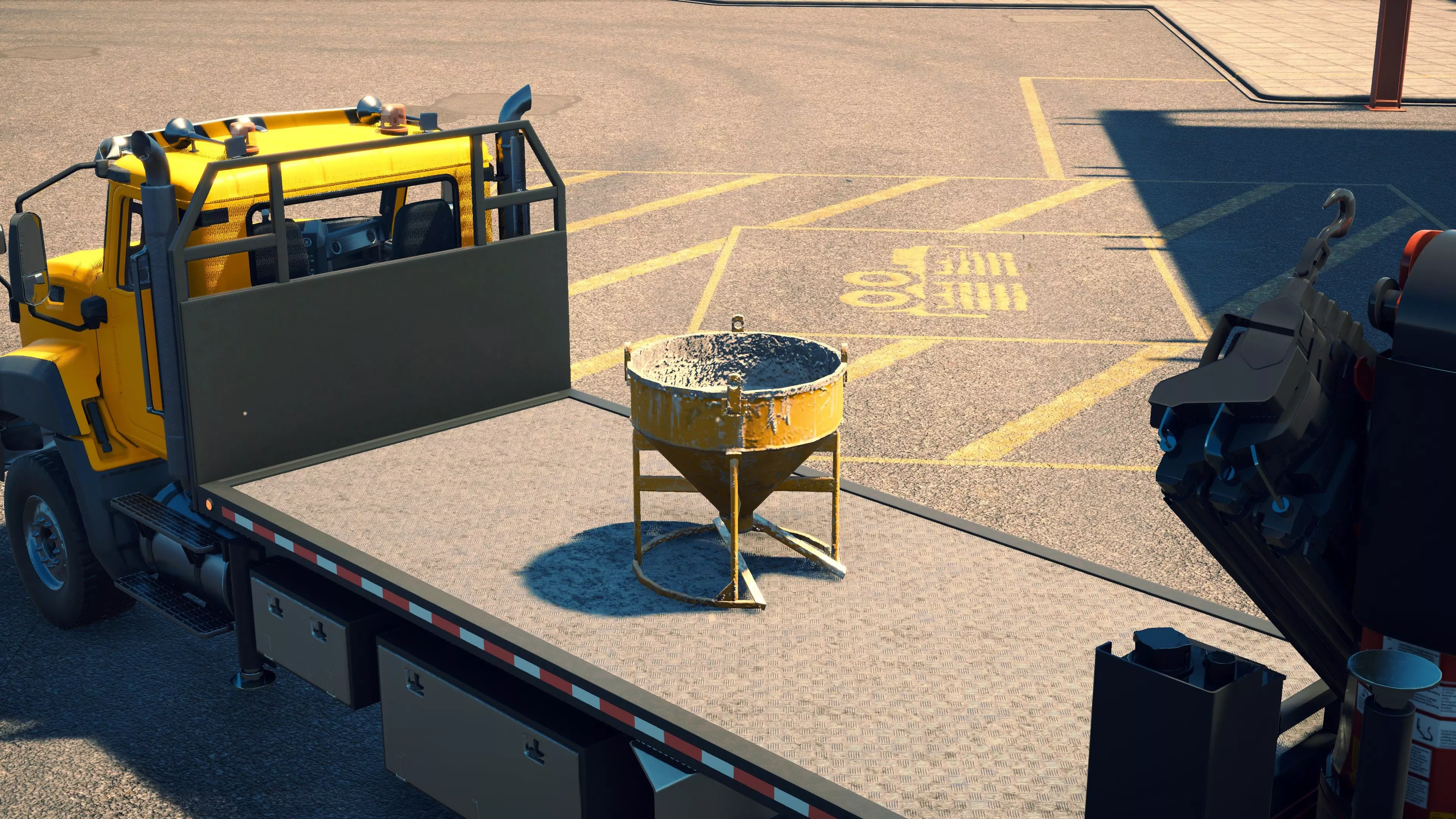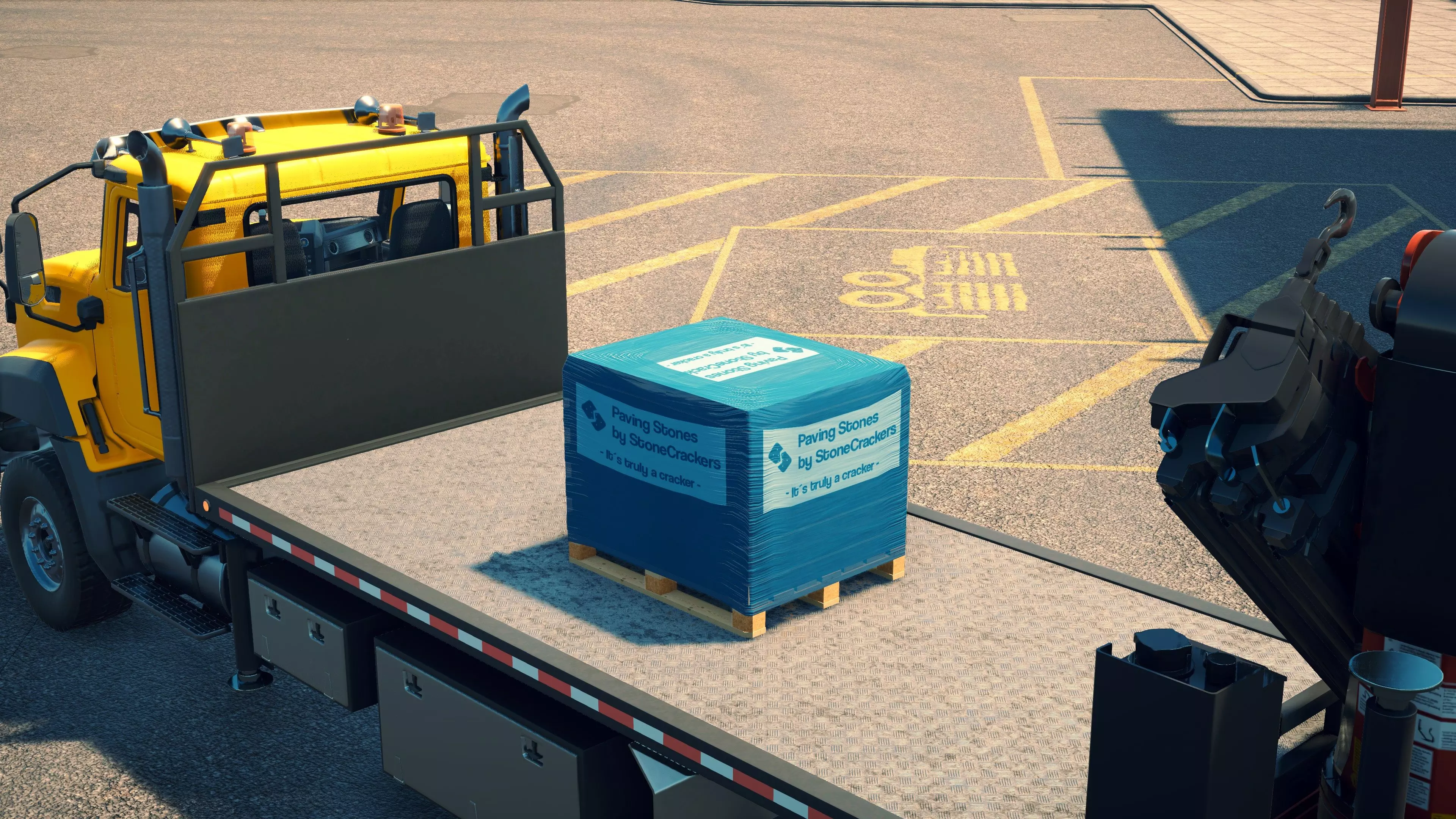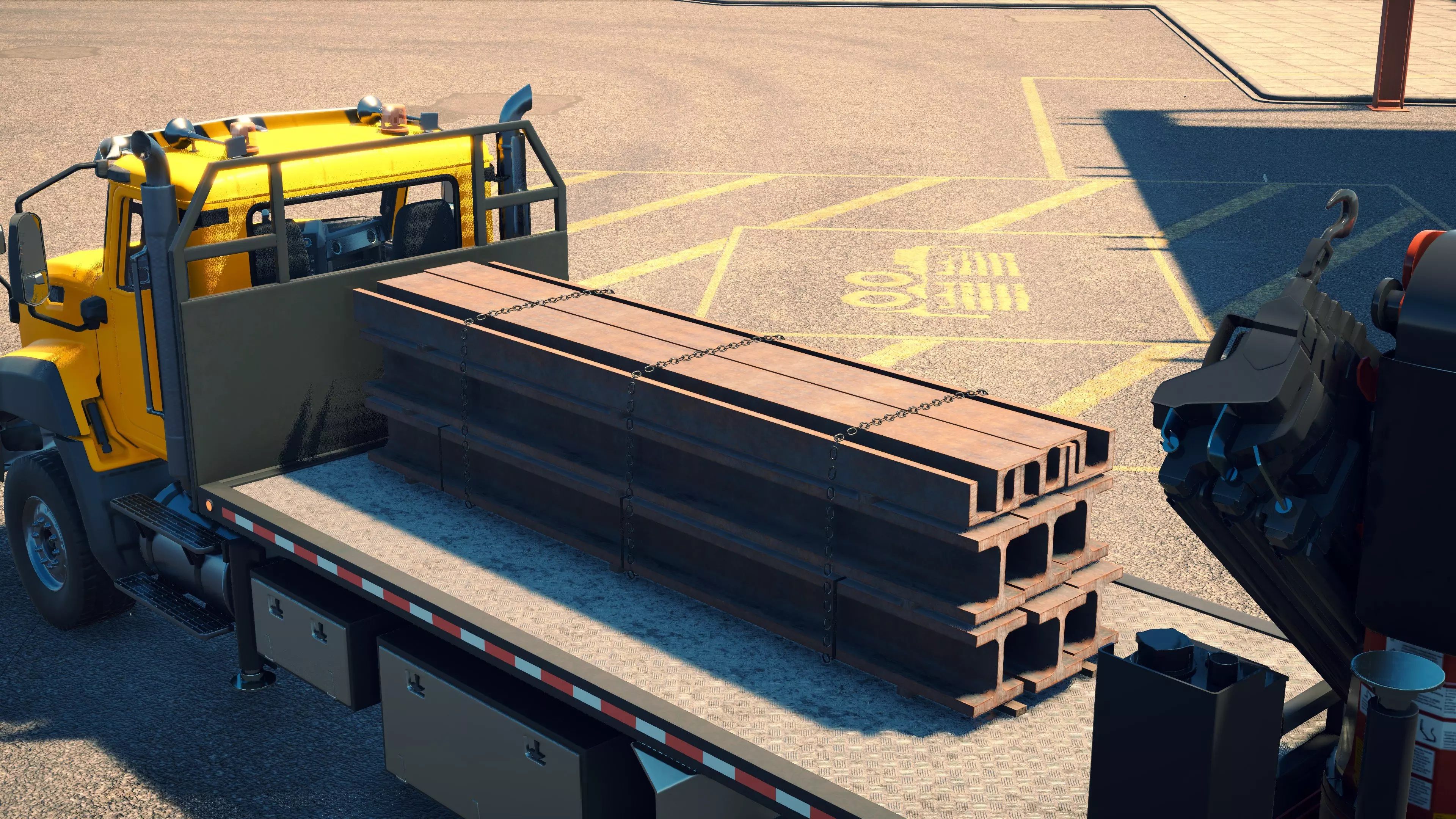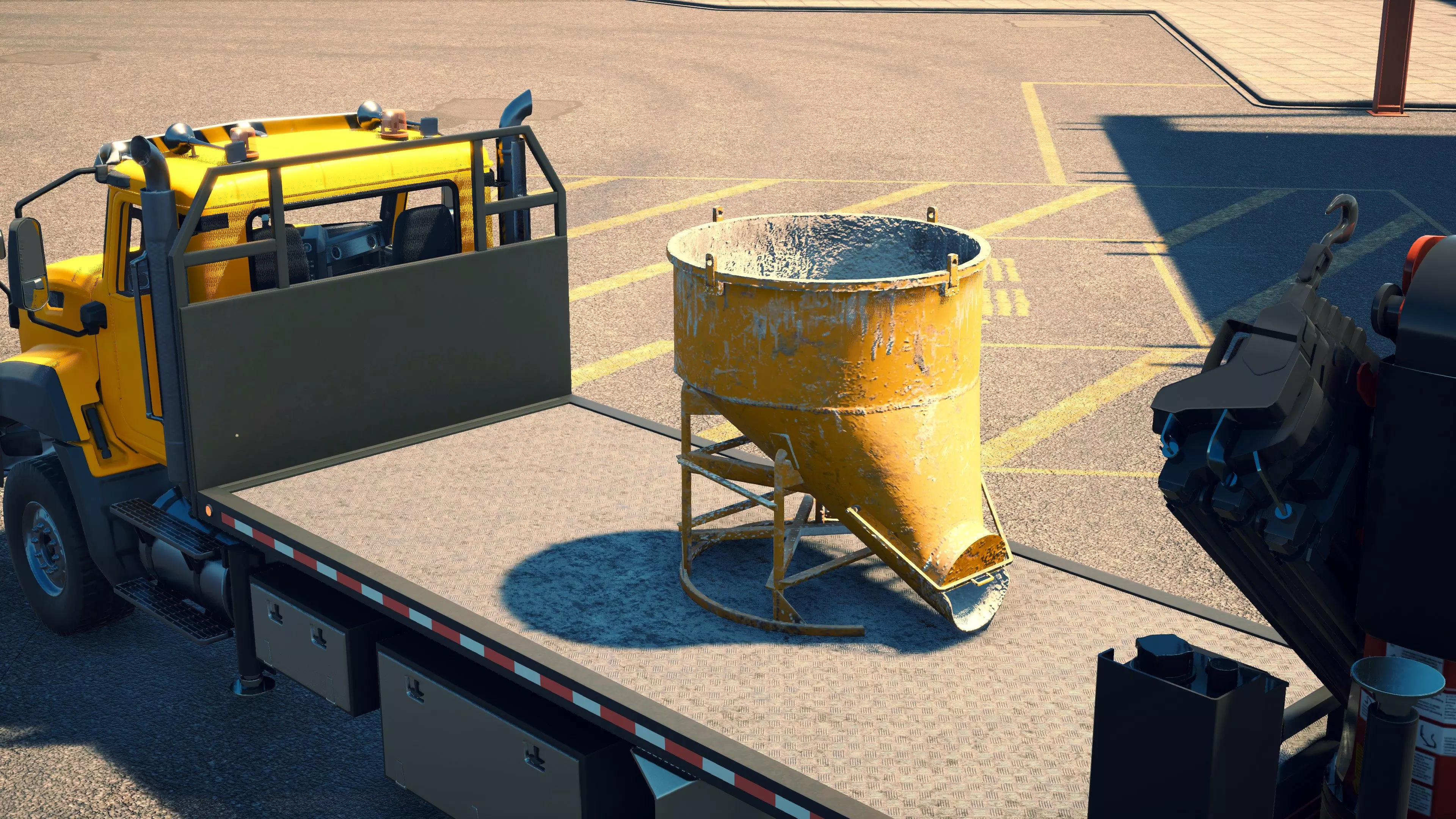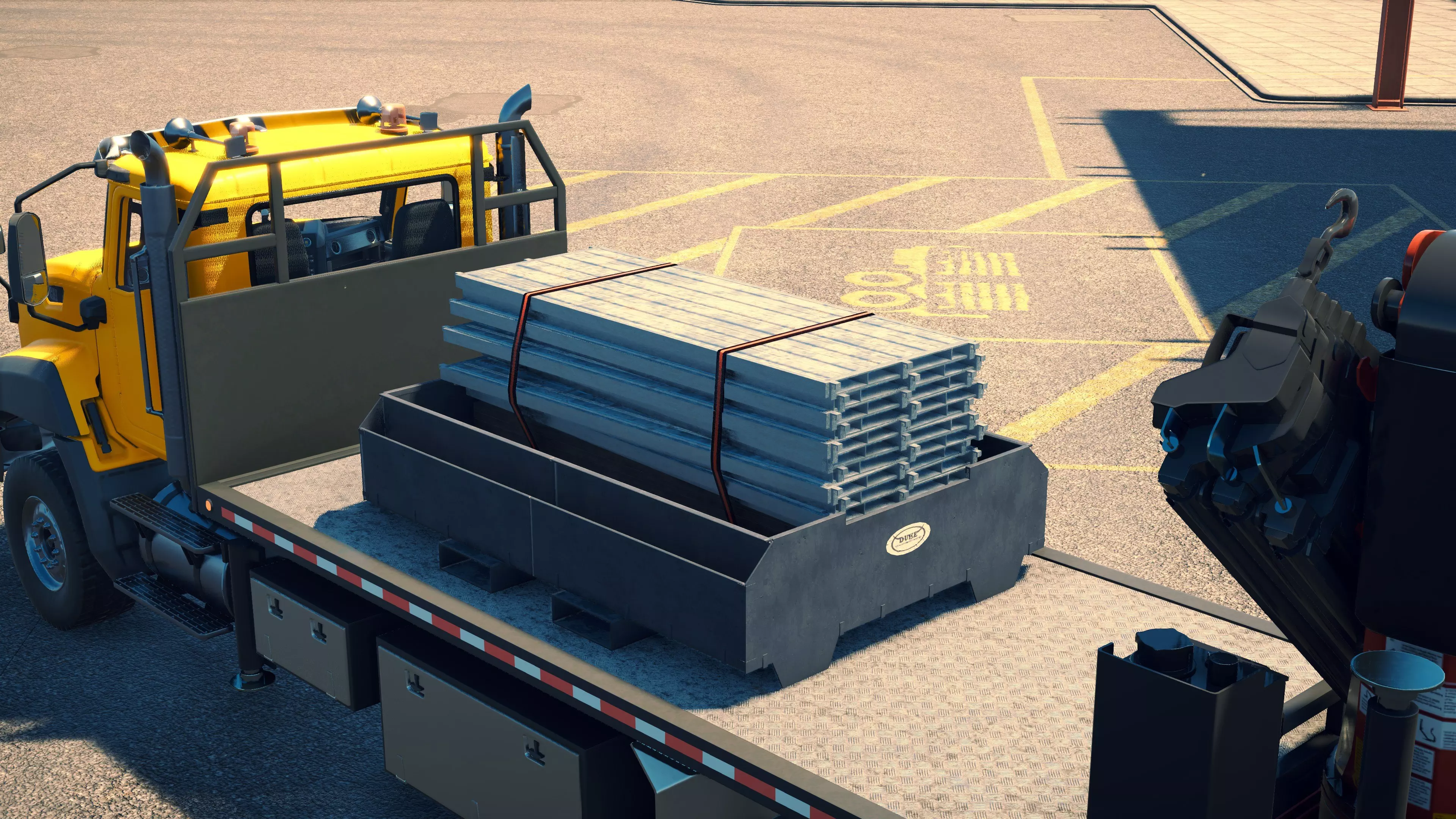 MAN TGS/帕尔芬格 PK 27002/迈勒 D316 购买/租赁 - 100,000美元/2000美元 长度 - 8.26米 宽度/带支架宽度 - 2.92米/5.36米 高度/带支架高度 - 3.66米/3.7米 转弯直径 - 17米 最高速度 - 93公里/小时/14公里/小时 加速度 - 10秒内达到60公里/小时 货舱(单位) - 21长/10宽/10高(4.2米/2米/2米) 散装物料容量 - 8.22立方米 压力测试 - 2分00秒 起重机最大作业半径 - 16米 最大吊钩高度 - 19.5米 360度旋转时间 - 13.5秒 起重机展开/折叠时间 - 10.5秒 起重机伸出/缩回时间 - 13秒 起重等级 - A 可以说,这是两款平板起重机中更出色的一款。其最高速度和加速度几乎相同,上坡时能更好地保持速度,不过更容易失去牵引力。正如你对平头驾驶室车型的预期,它体型更小,转弯直径也更紧凑。它也配备了相同型号的起重机,但这辆卡车真正的优势在于其运输散装物料的能力,这足以弥补货厢面积较小的不足。其装载量超过肯沃斯T880自卸卡车的40%,这一优势不容小觑。当然,一旦拥有了专用的自卸卡车,你就不会再想用它了。但在初期,当你需要充分利用现有资源时,它的多功能性非常突出。 带起重机的拖拉机