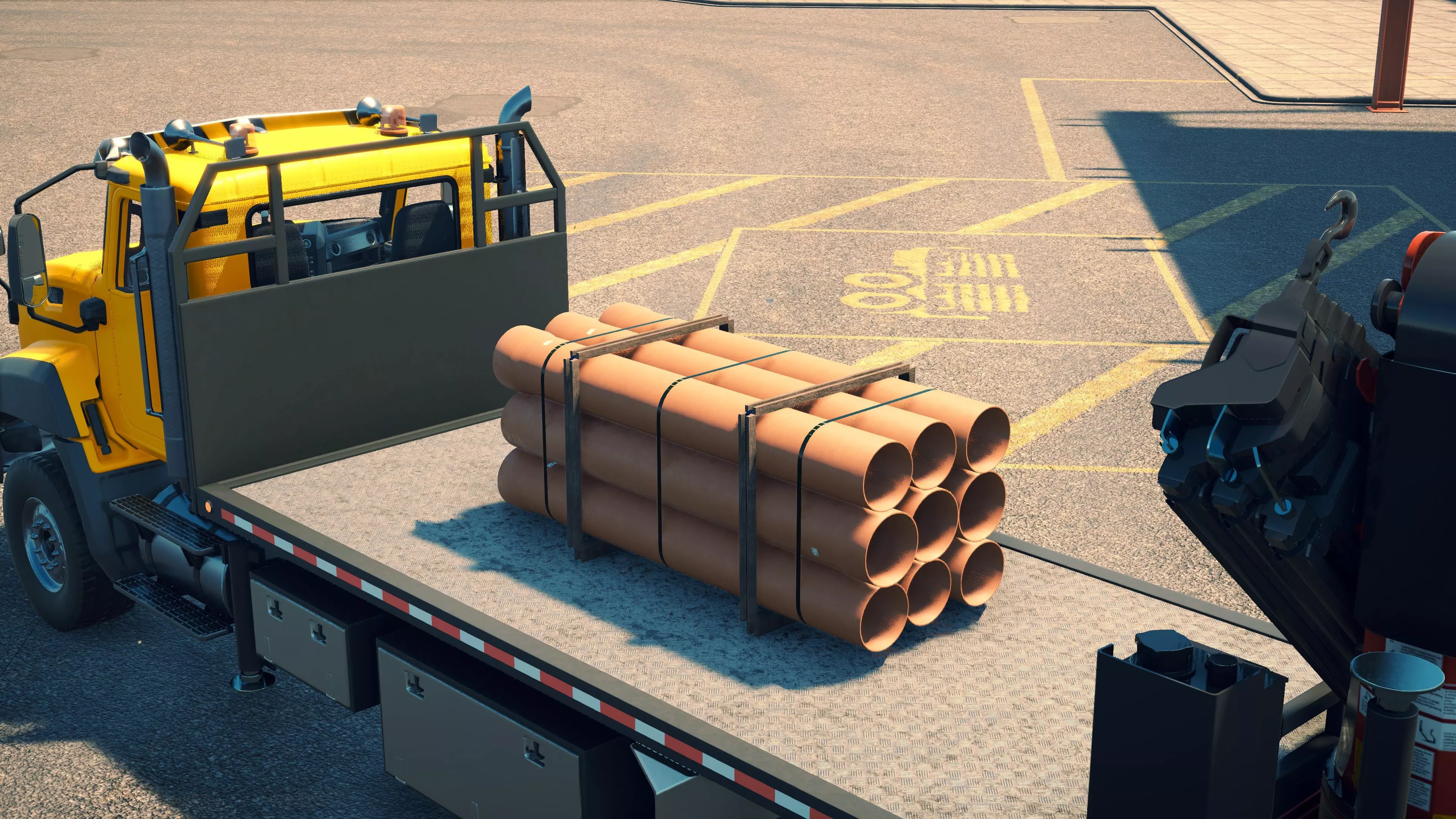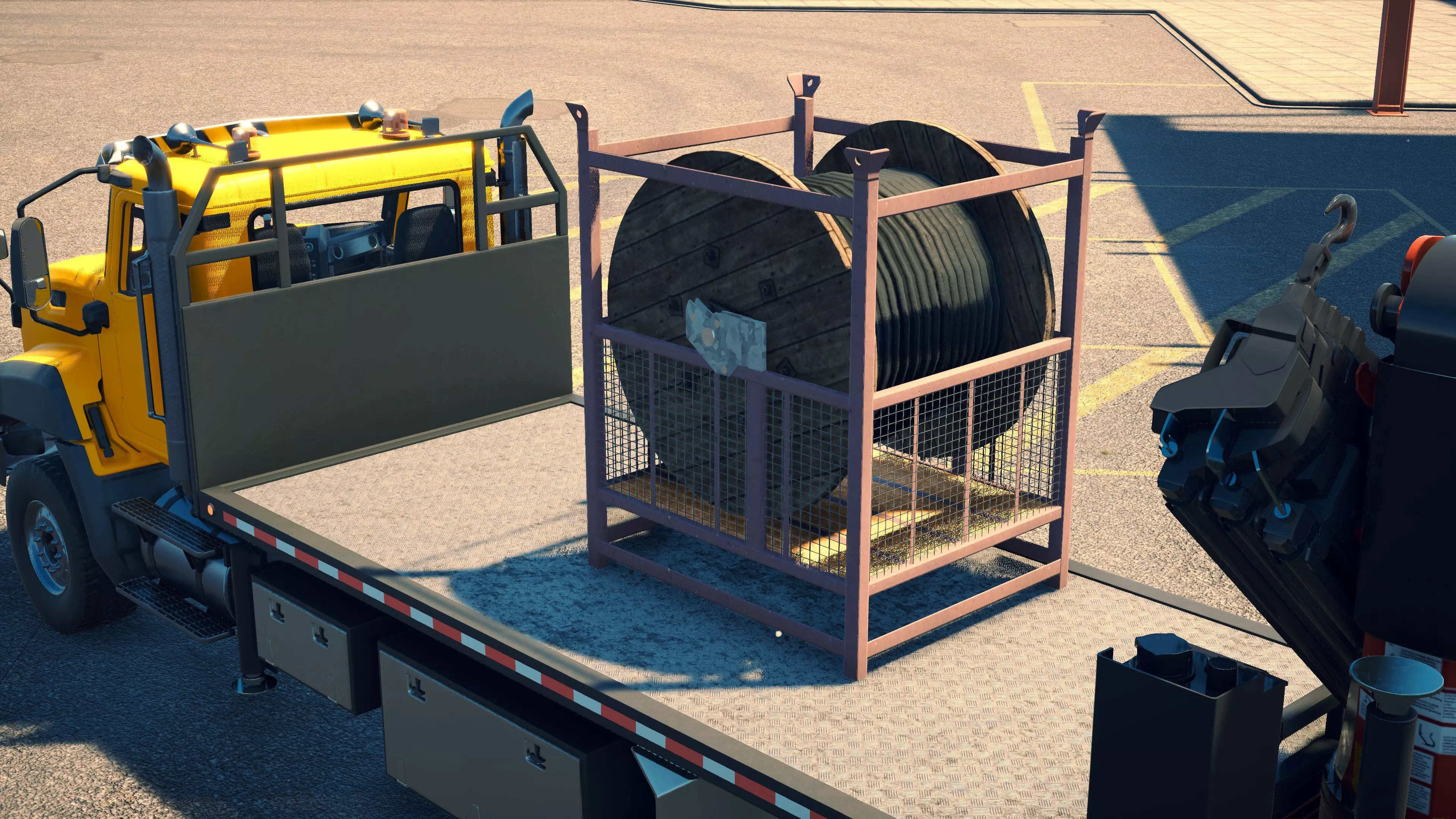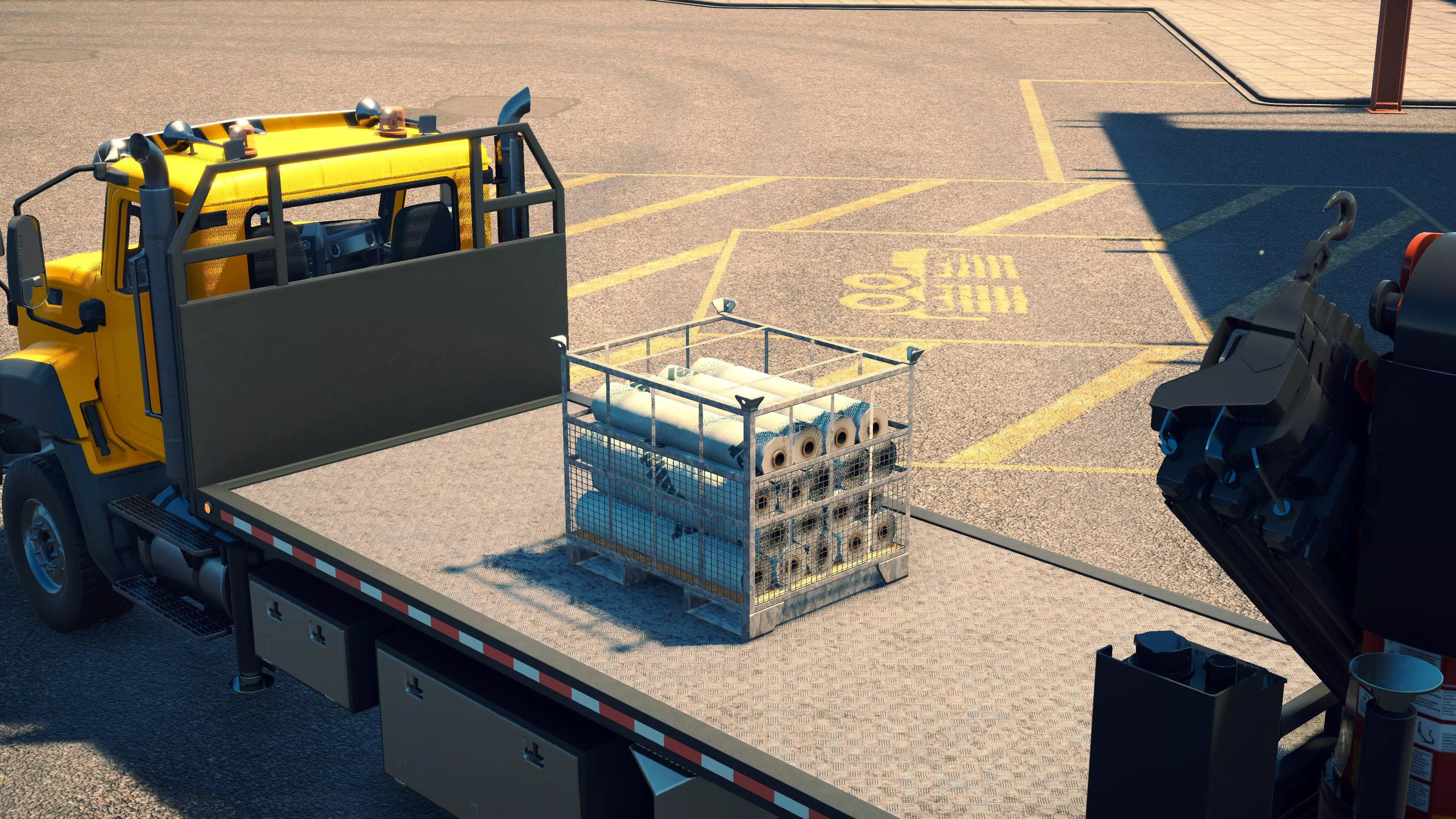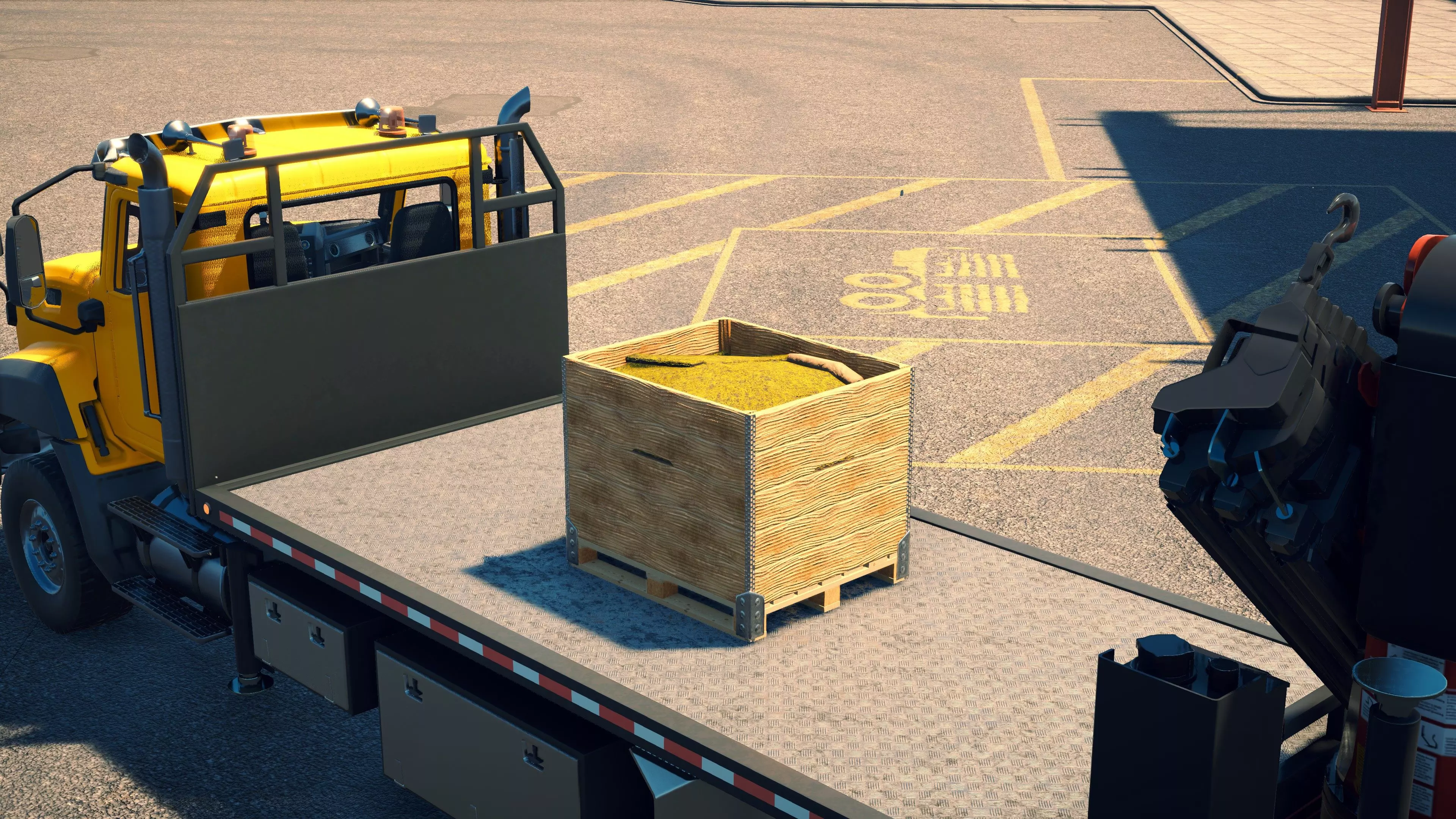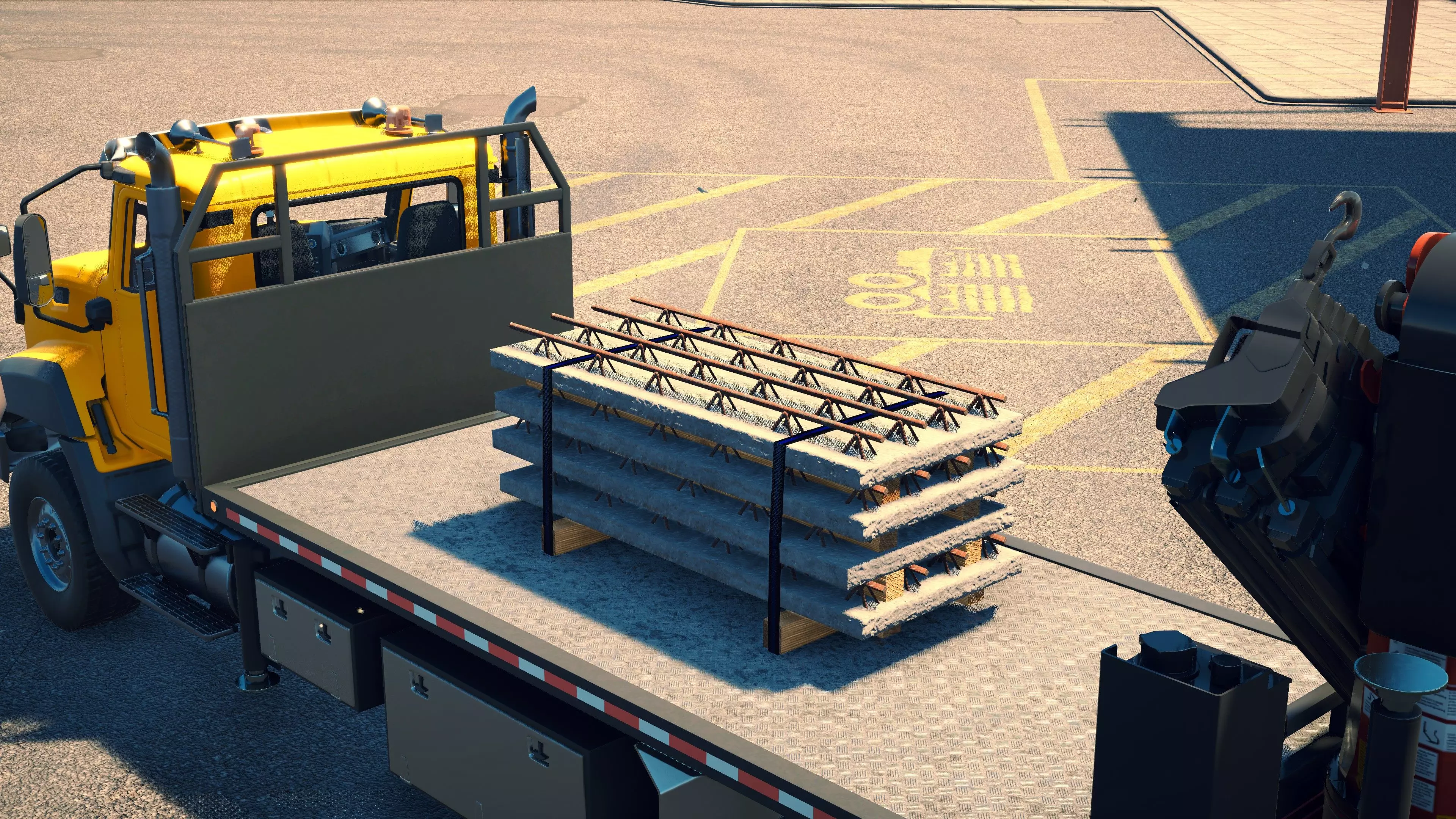 MAN TGS/帕尔芬格 PK 27002/迈勒 D316 购买/租赁 - 100,000美元/2000美元 长度 - 8.26米 宽度/带支架宽度 - 2.92米/5.36米 高度/带支架高度 - 3.66米/3.7米 转弯直径 - 17米 最高速度 - 93公里/小时/14公里/小时 加速度 - 10秒内达到60公里/小时 货舱(单位) - 21长/10宽/10高(4.2米/2米/2米) 散装物料容量 - 8.22立方米 压力测试 - 2分00秒 起重机最大作业半径 - 16米 最大吊钩高度 - 19.5米 360度旋转时间 - 13.5秒 起重机展开/折叠时间 - 10.5秒 起重机伸出/缩回时间 - 13秒 起重等级 - A 可以说,这是两款平板起重机中更出色的一款。其最高速度和加速度几乎相同,上坡时能更好地保持速度,不过更容易失去牵引力。正如你对平头驾驶室车型的预期,它体型更小,转弯直径也更紧凑。它也配备了相同型号的起重机,但这辆卡车真正的优势在于其运输散装物料的能力,这足以弥补货厢面积较小的不足。其装载量超过肯沃斯T880自卸卡车的40%,这一优势不容小觑。当然,一旦拥有了专用的自卸卡车,你就不会再想用它了。但在初期,当你需要充分利用现有资源时,它的多功能性非常突出。 带起重机的拖拉机
