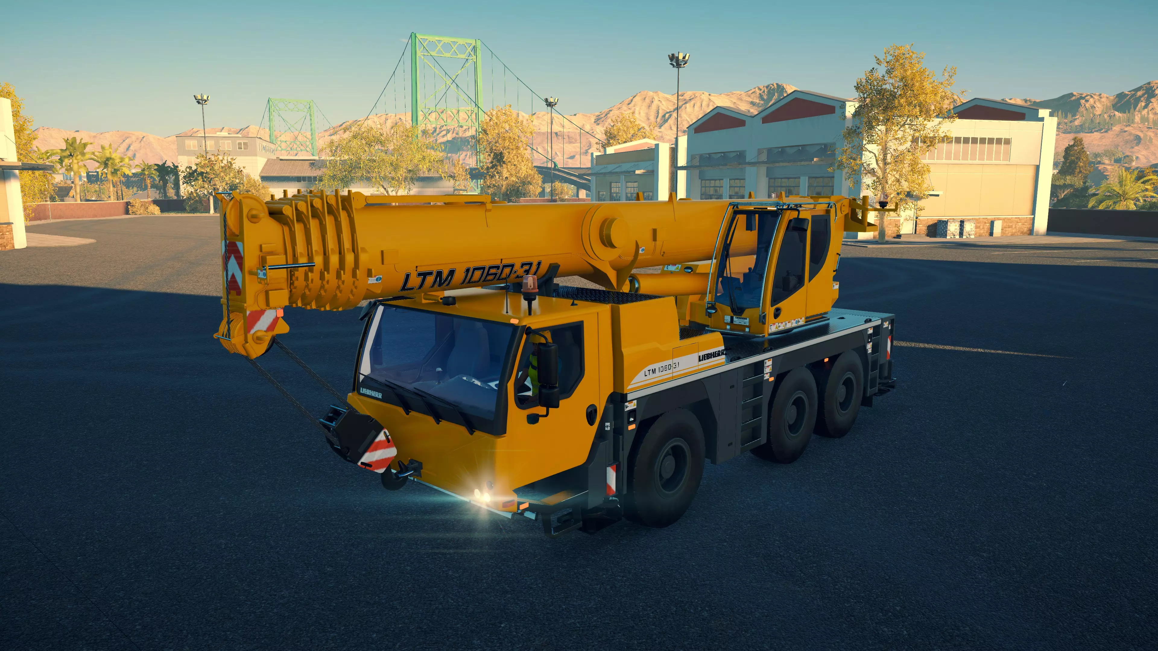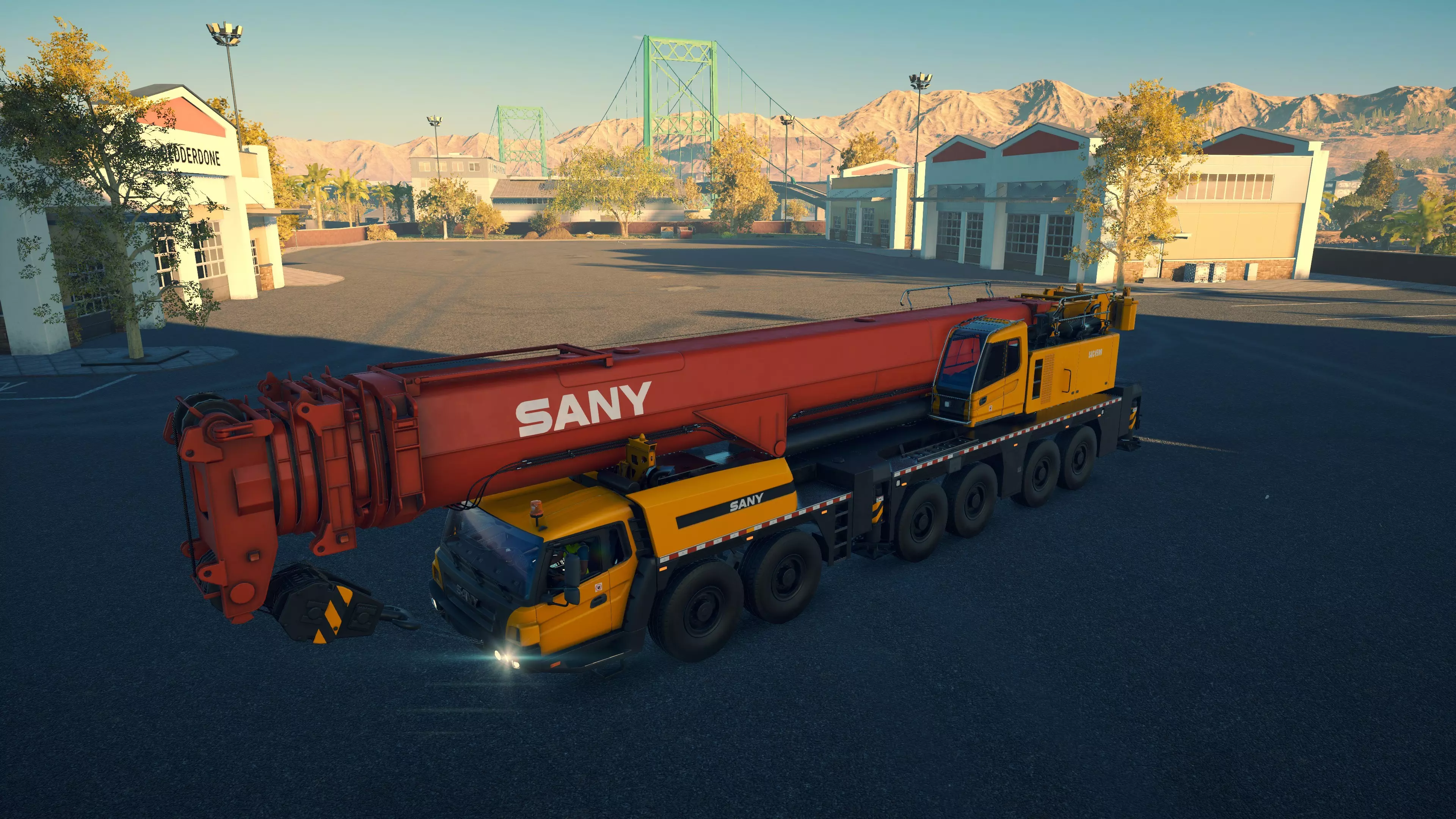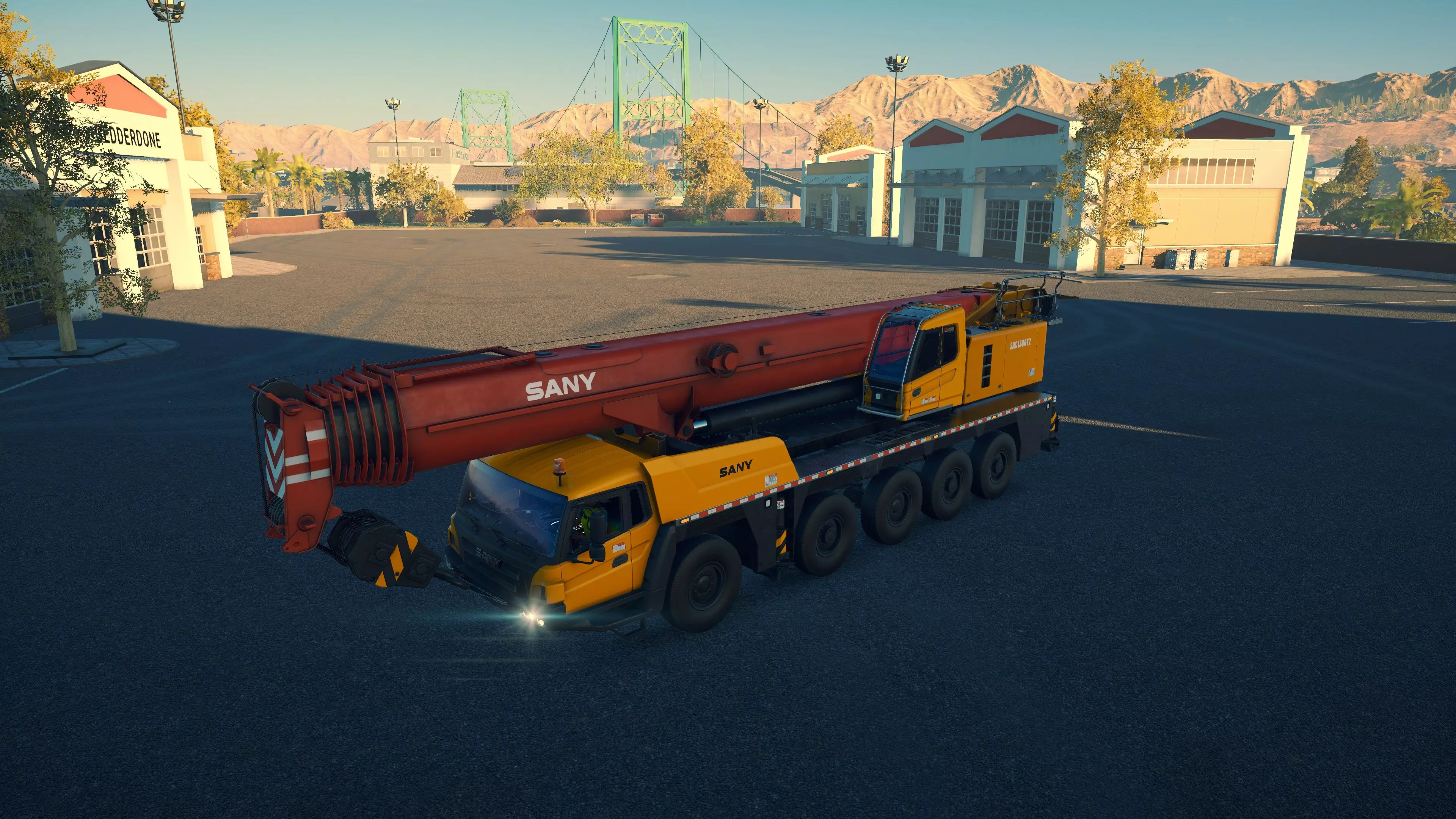 三一重工 SAC1300T2 购买/租赁 - 375,000美元/7,500美元 长度/带支架 - 15.6米/16.3米 宽度/带支架 - 3.24米/9米 高度/带支架 - 4.4米/4.4米 转弯直径 - 14米 最高速度 - 87公里/小时/9公里/小时 加速性能 - 14.5秒内加速至50公里/小时 最大吊臂长度 - 64米 最大吊钩高度 - 66米 360度旋转时间 - 25.5秒 吊钩升降时间 - 14.5秒 吊臂升降时间 - 15.5秒 吊臂伸缩时间 - 24秒 起重等级 - D级 相比LTM1060仅多花费58,000美元,这台起重机堪称一笔相当划算的交易,因为你能获得约20%的额外作业半径,并且可以吊起游戏中的任何物品。它体型稍大,灵活性略低,加速也稍慢一些,但额外的成本和这些小缺点都被其增强的性能所弥补。三一重工起重机的一大优点是,当你抬高吊臂时,起重机的操作室会随之倾斜,这意味着在内部视角下,你可以抬头足够高来追踪吊钩。此外,它的两侧还配备了一组不错的泛光灯,方便夜间作业。